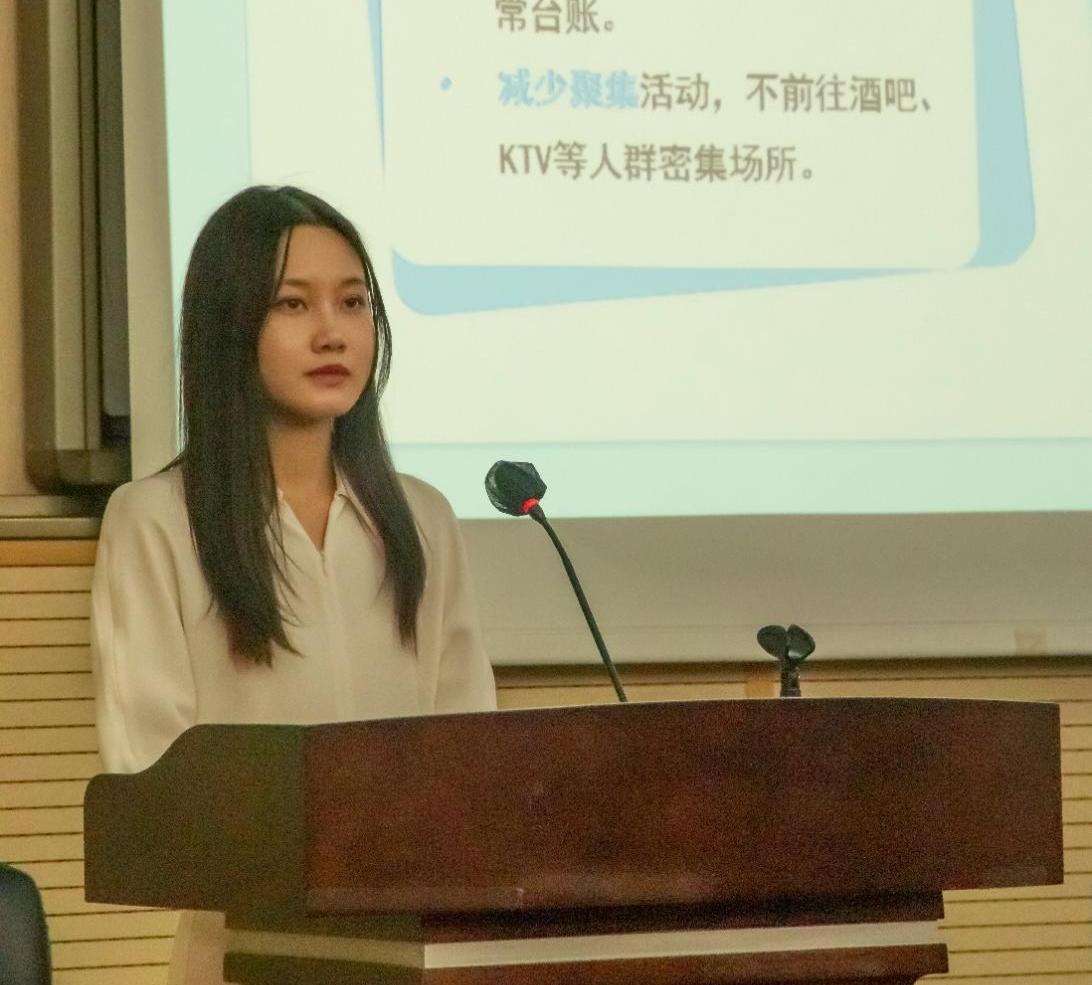 第四个宣传环节,主持人杨骐玮同学从全国疫情现状、疫情防护知识、心理抗疫指导三个角度宣传疫情防控相关知识。介绍了新冠变异株奥密克戎的特点及感染症状;分享了科学的防疫方法以及心理抗疫指导,有效地帮助同学们了解更多关于防疫的知识,学习有效的防疫办法。