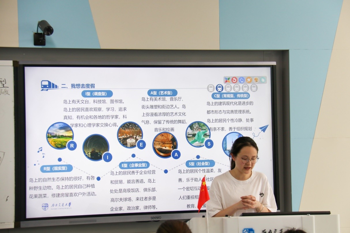 班会第二个环节叫做“世界那么大,我想去度假”,背景设定为同学们获得一次免费度假游的机会,可以选择去企事业型、研究型、艺术型、常规型、社会型、现实型六个岛屿。这个游戏与霍兰德职业兴趣测试相结合,同学们可以参考测试表格结果进行岛屿选择。同学们对六个岛屿的选择可以体现出同学们不同的职业兴趣和职业品质,帮助大家可以更好地了解自己。到场的三位老师也参与了本次测试,陈海波还就自己的选择和测试结果进行了分享。