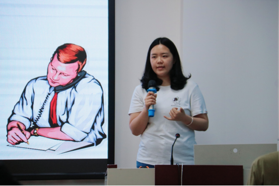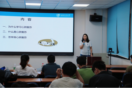 首先,医学院党员服务先锋队队长喻谦讲述了一些患者因心脏骤停或者呼吸骤停却得不到及时有效的救助而不幸离世的实例,突显学习急救知识、掌握急救技能的重要性。随后喻谦向同学们讲解了心肺复苏的概念及操作流程,整个操作流程大致分为以下八个步骤:评估环境、判断意识、高声呼救、摆放体位、判断呼吸、胸外心脏按压、打开气道、人工呼吸。她详细地向同学们解释了每一个步骤的注意事项,并重点指出了评估环境的关键性,强调了在救助他人的同时更要保护好自身的安全。