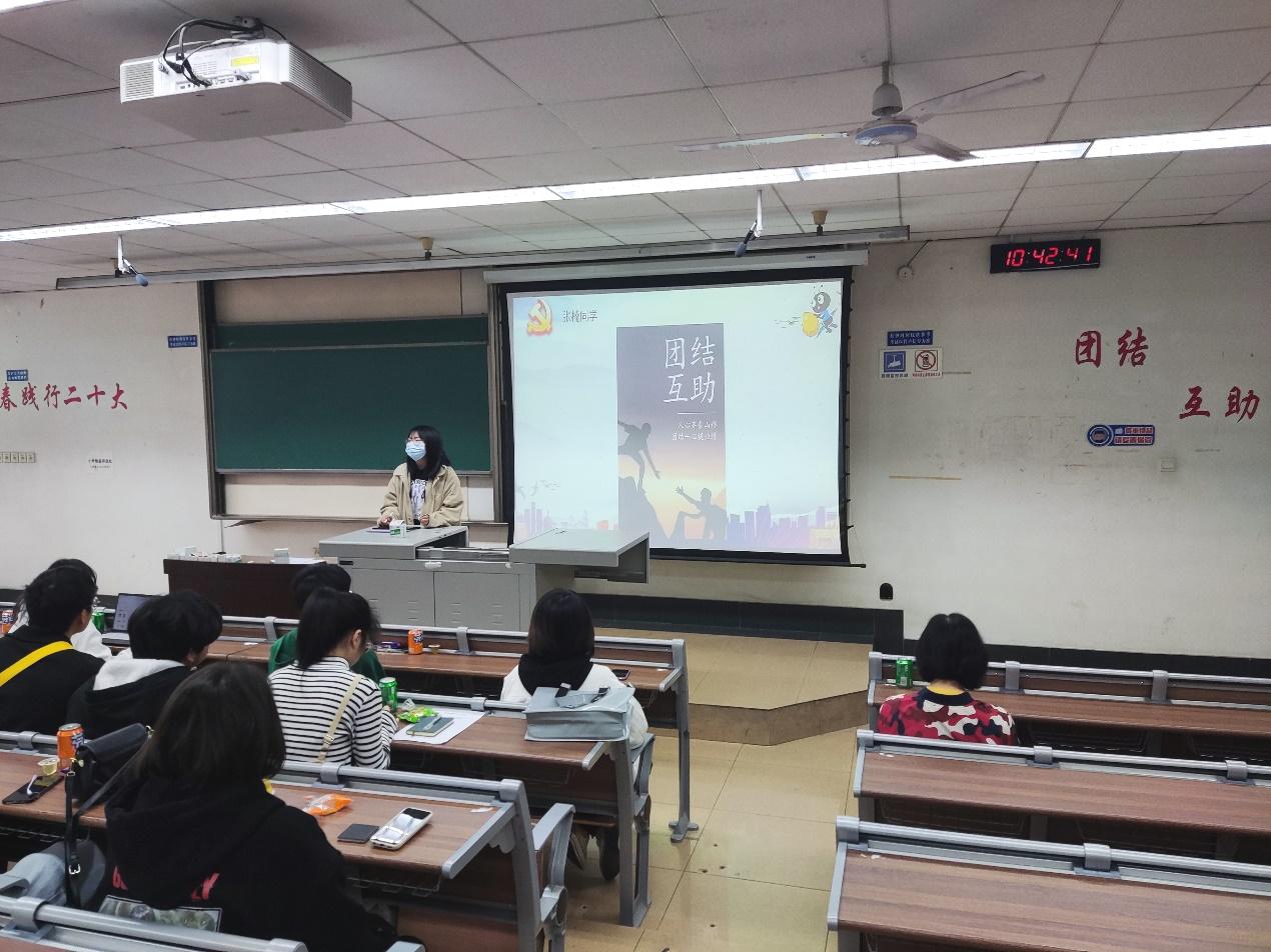 首先,辅导员莫代玉以“团结”“人类命运共同体”两个关键词,引出了今天的主题。她强调,我们身处同一个集体,应当保持团结,班委在平时要做好工作,同学们要积极配合,共同为建设更优秀的班集体而努力。同时,莫代玉提出,同学们应当保持良好的心理状态,注重锻炼身体,在学习之余,多了解有关保研、考研、就业等方面的相关信息,做好生涯规划。