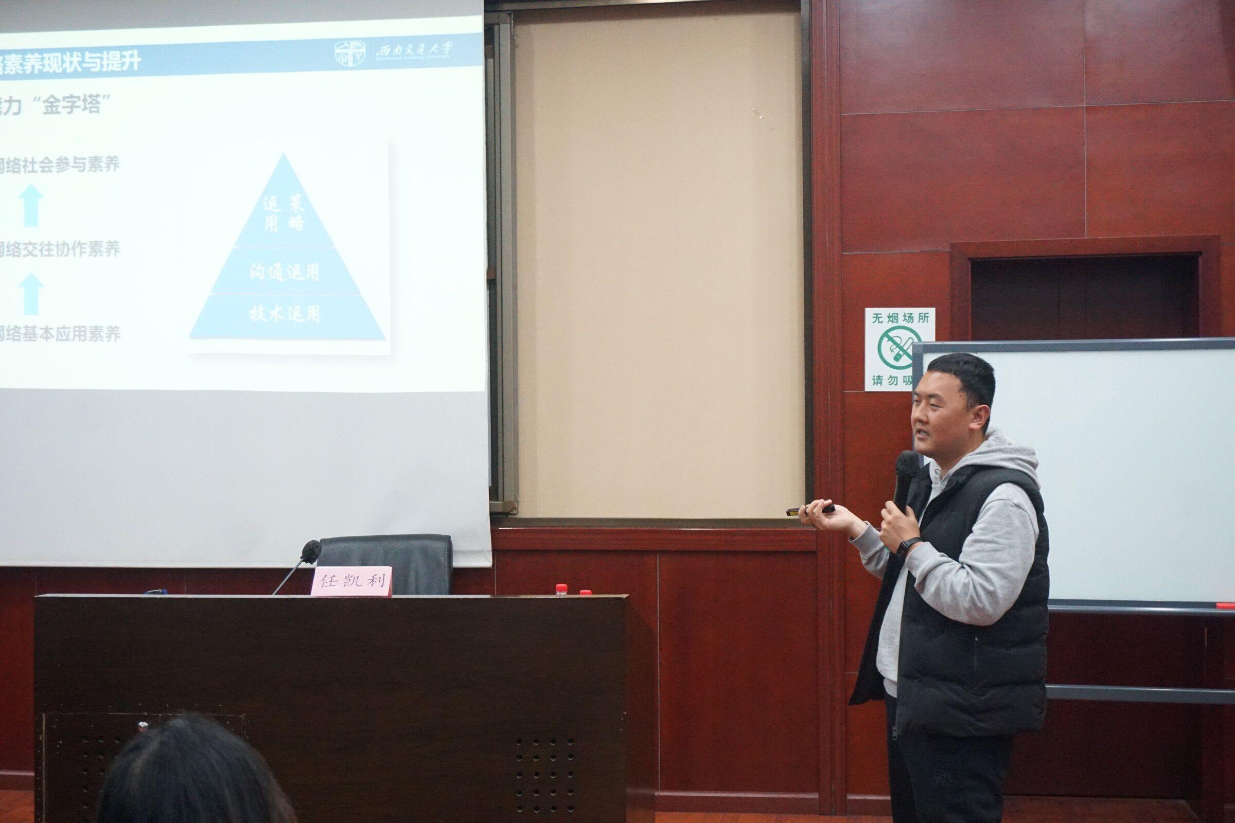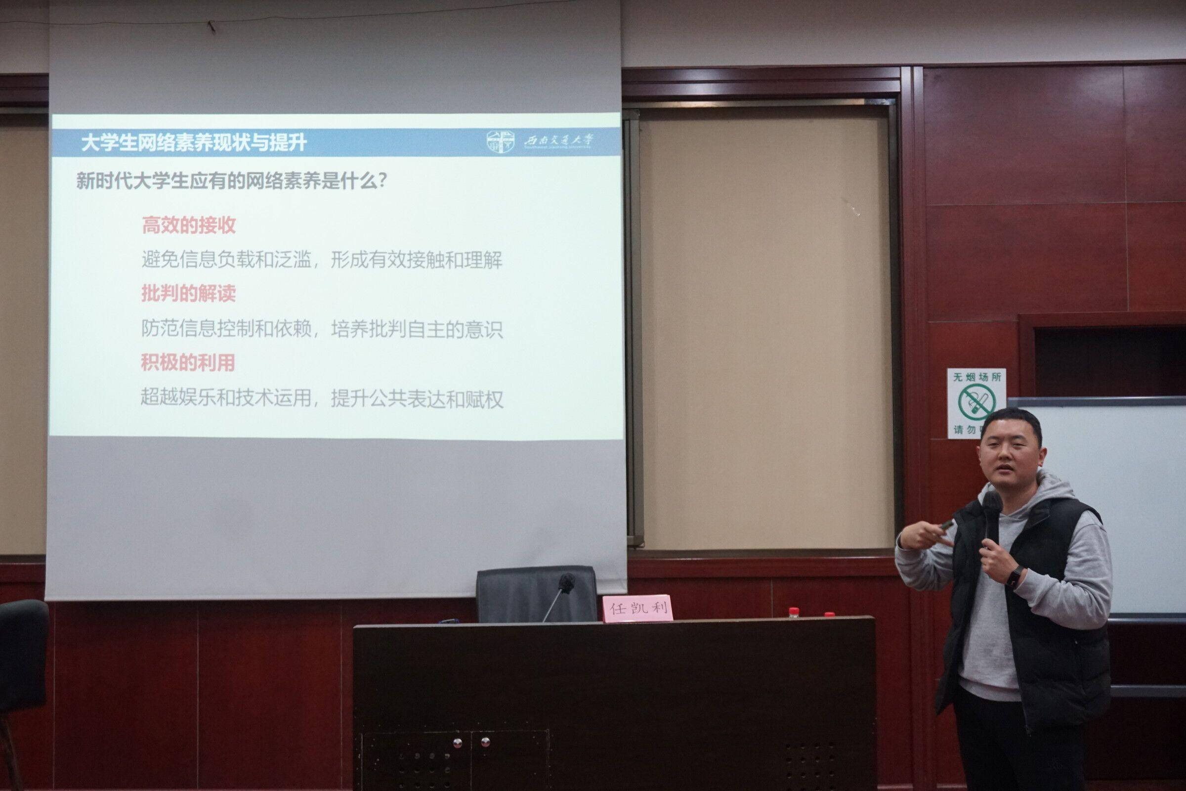 团委兼职副书记,茅以升综合办公室主任、校青年讲师团成员、交大Kelly说网络思政工作室负责人任凯利主讲,主题为“与新媒体共舞——大学生网络素质提升”,旨在帮助同学们提升网络素养,合理运用各种新媒体。