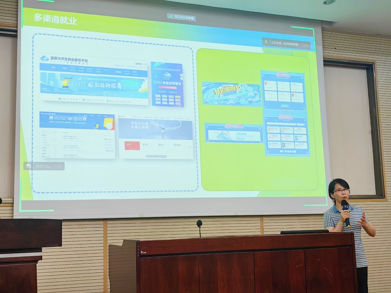 会议伊始,王哿老师针对2023届毕业生就业形势再次进行分析指导。王老师就2023年春季校招形势举例,引出就业岗位拓展难度增加、就业竞争激烈,强调同学们应该培养自己的核心竞争力,结合自身条件,多渠道就业,多方面考察就业单位,选择适合自己的工作。王老师也鼓励学生利用好学校资源,多找辅导员老师沟通交流。王老师通过对比以往数据与政策解读,深入分析考研招生现状,总结考研免研比例变化趋势,建议学生深思熟虑后再做出决策,慎重考虑硕士学历对学生的“投资回报率”,同时强调学生考研应与未来职业规划深入绑定,珍惜自己应届毕业生身份,做好个人的生涯规划,实现自我的提升。