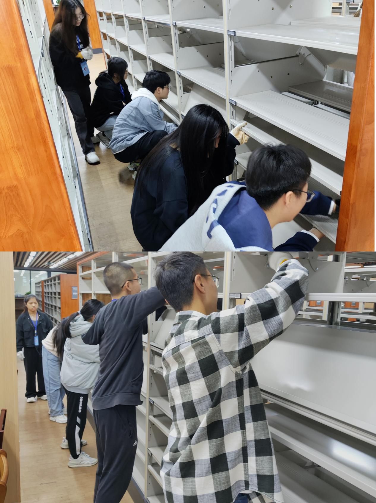 书架的安装、重组和清洁是图书馆日常管理中三个非常重要的环节。在负责老师的指导下,同学们在指定的活动区域有条不紊地进行合作,或是拿起螺丝刀将图书架进行微调;或是仿照其他图书架进行重新组装;或是对图书架进行清洁,保证其卫生。在老师的悉心指导下,同学们互相交流经验并互帮互助,很快就得心应手起来。