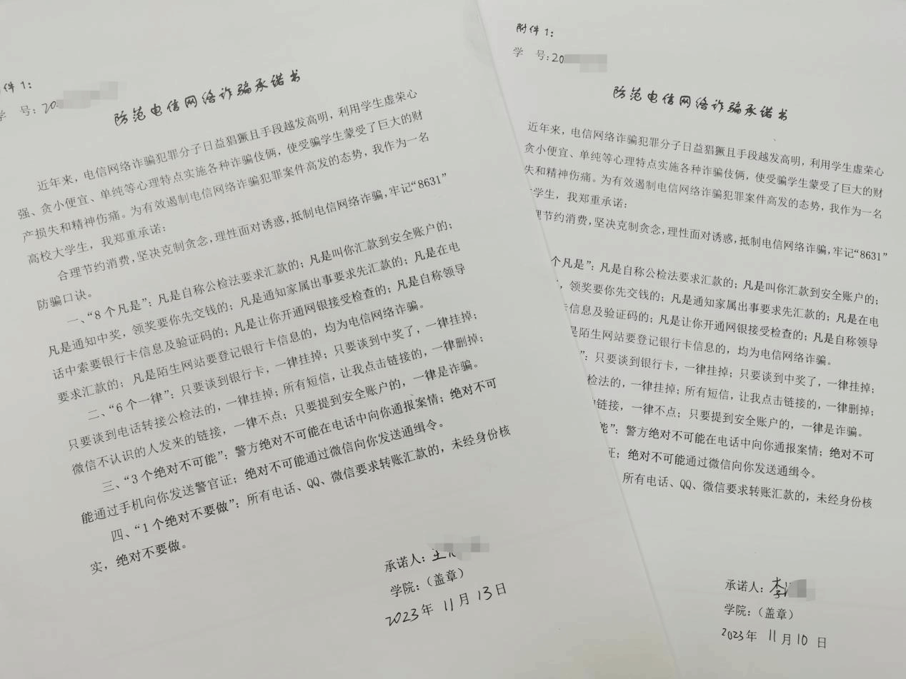 本科2023级通过主题班会、年级大会等开展防范电信网络诈骗教育,组织新生学习反诈知识,组织新生签署防范电信网络诈骗承诺书和《拒绝买卖、转借、转租手机卡、银行卡等涉嫌违法犯罪承诺书》,提高同学们防骗意识和防骗能力。