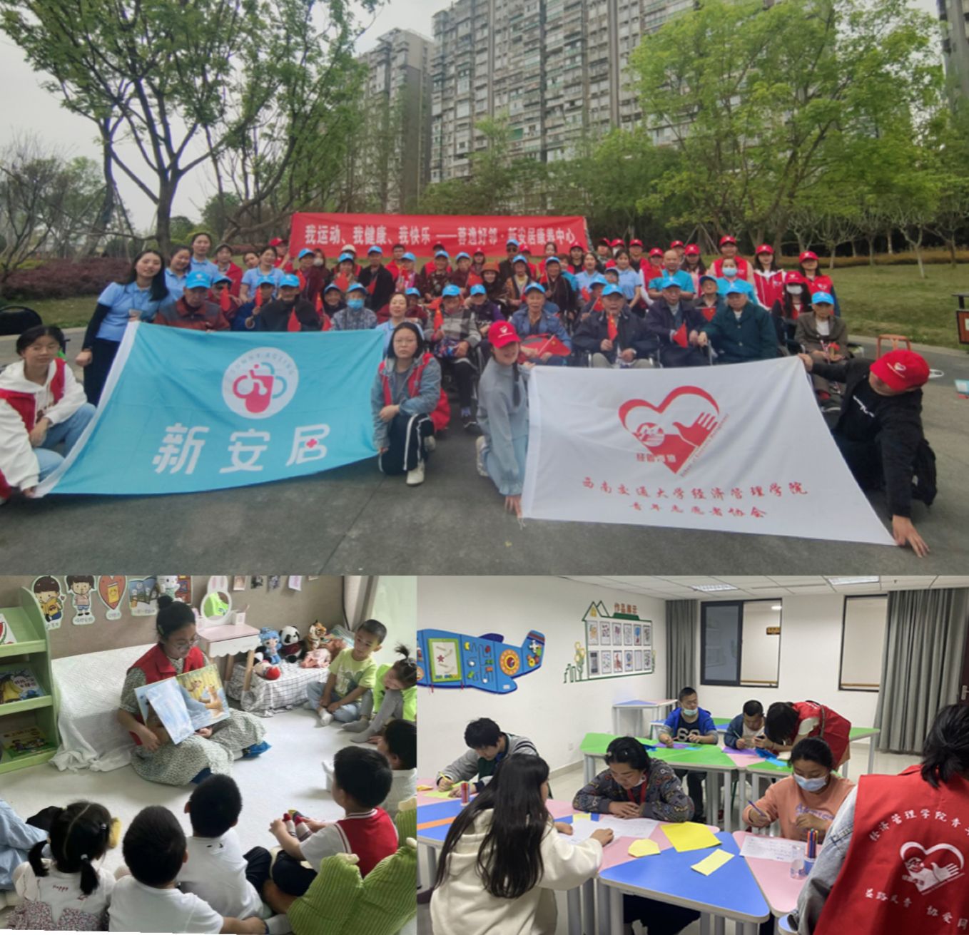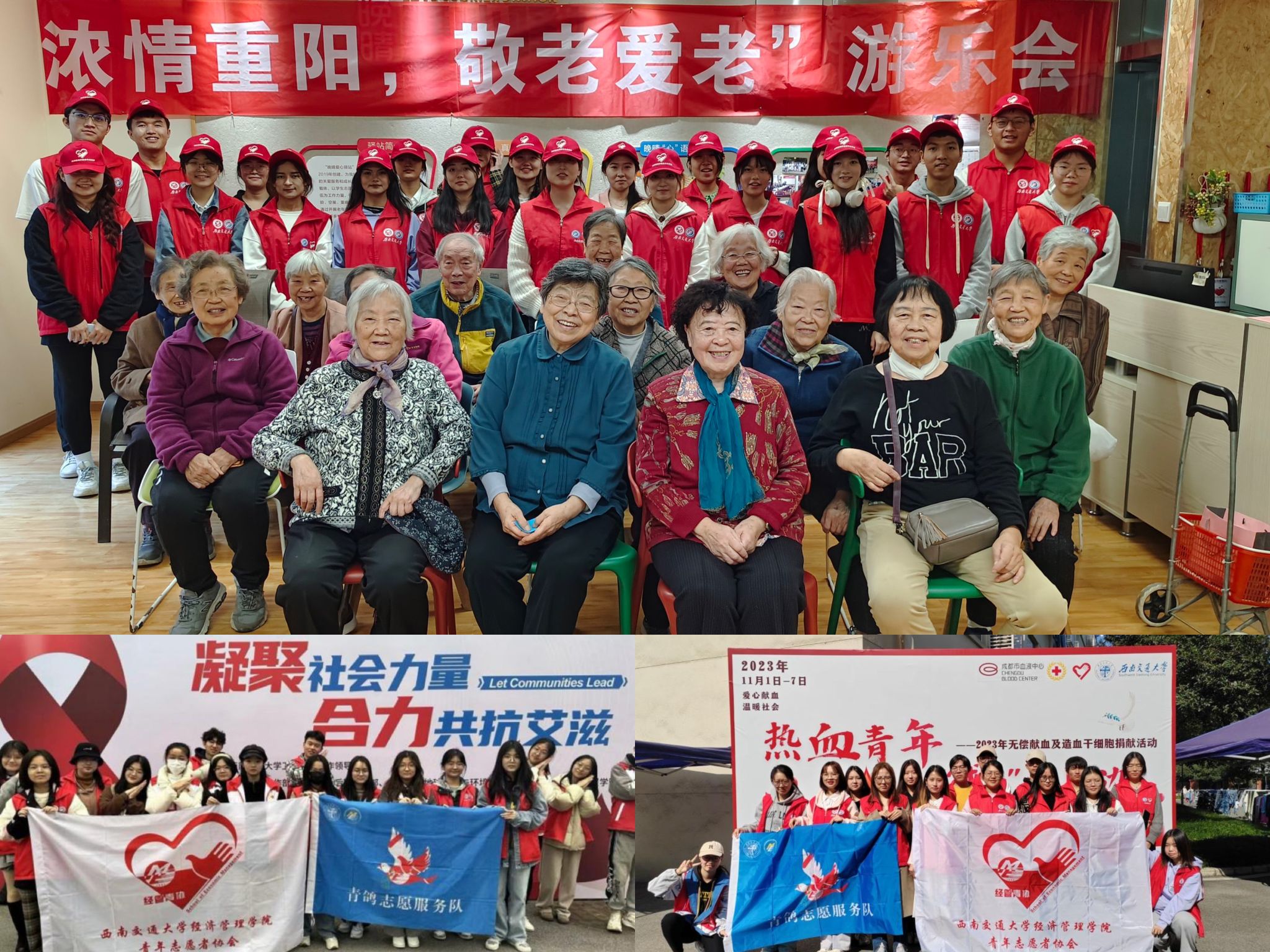 青年志愿者协会深入实施“青春志愿·爱在社区”大学生志愿服务社区行动,与四个社区签订协议并建立长期志愿服务基地,新增“喜安社区”“新安居养老院”两个志愿服务基地,常态化开展“阳光家园”、“敬老院”、“善工家园”、“交大幼儿园”基地志愿服务,将爱心向外蔓延:在金牛区茶店子街道居家养老服务中心为老人送去关怀;在金牛区色色啦