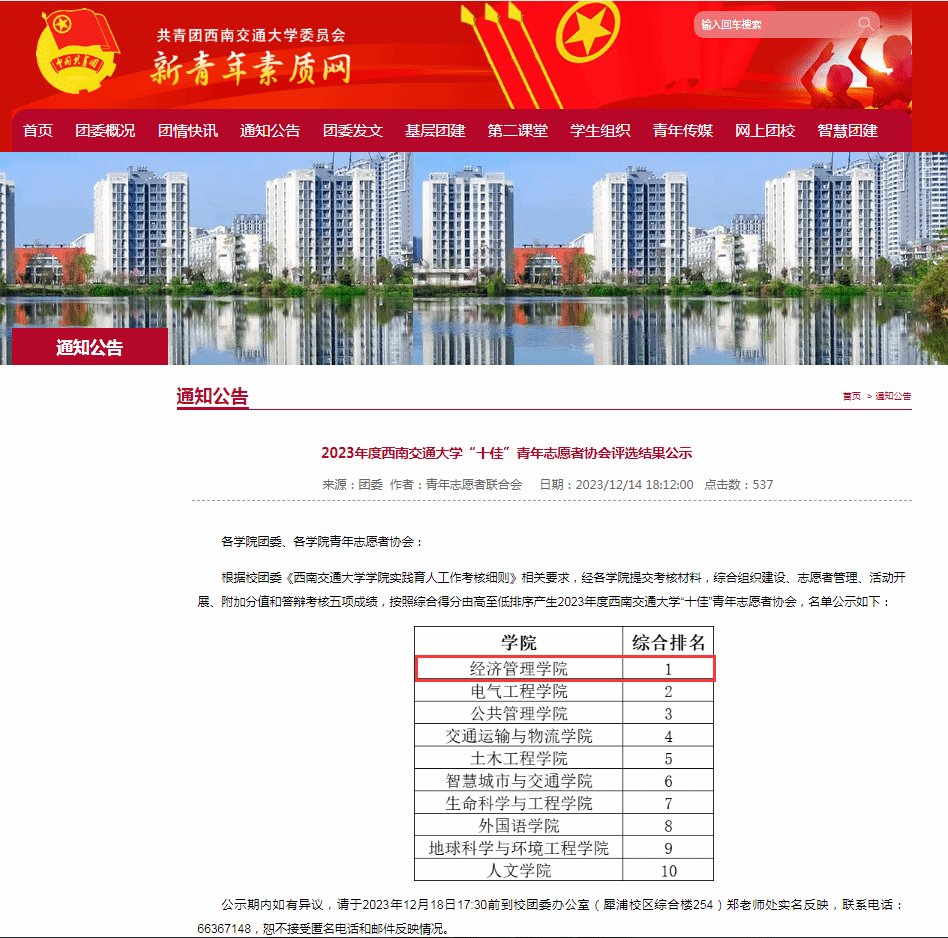 青年志愿者协会在校团委、学院党委、团委坚强正确领导下,全体成员团结一心,步调一致,工作认真务实,积极探索实践育人模式,创新性地开展各项社会实践和志愿服务活动,圆满地完成了各项任务,有力地配合了校、院团委的工作,协会各方面都洋溢着生机和活力。在学校年底进行的“2023年实践育人工作”考核中,我院青年志愿者协会综合考评第一,获得“十佳青协”荣誉,取得了优异的成绩。