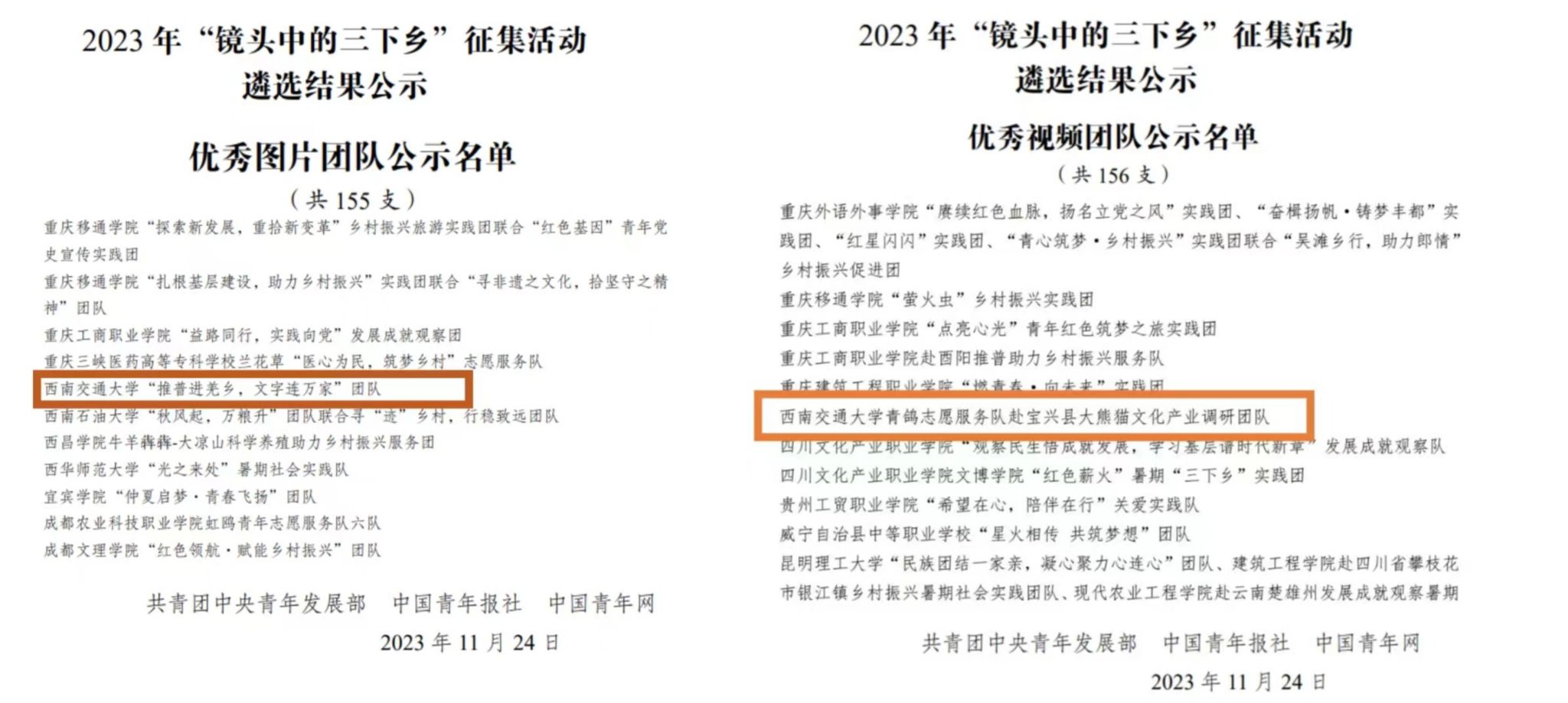 两支大学生暑期“三下乡”团队入选2023年全国大学生暑期社会实践优秀团队,6支队伍获评寒、暑假校级社会实践优秀队伍,19名同学获优秀实践队员,4名老师获学校共青团实践育人优秀指导教师,收到实践地反馈信、感谢信共计20余份。实践队伍获中青校园、中国大学生网、今日头条、中国共青团官方杂志、“三下乡”官方微博等国家级报道27篇,四川法制报、四川学联、四川共青团官方微博等省级媒体报道7篇,以及县、市级等其他报道总计77篇。实践活动受到了社会的广泛关注,取得了积极的社会影响。同时,总结、表彰、宣传,树立典型,强化我院实践育人成效,先后发布我院实践队伍风采展新闻及推送6篇,展现了交大经管学子的良好风貌。