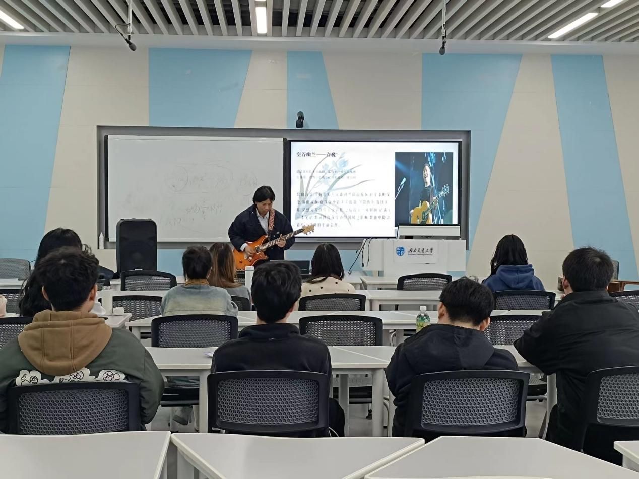 本次班会邀请到了人文学院“音乐下午茶”出品团队为班级同学带来"吉他菜单——和你在交大的街头走一走",首先由周玉豪同学讲述吉他的相关知识,携团队其他成员一起为大家演奏著名吉他曲,最后讲演团队带领经济一班全体成员一起弹奏吉他,激发同学们对音乐的热爱。