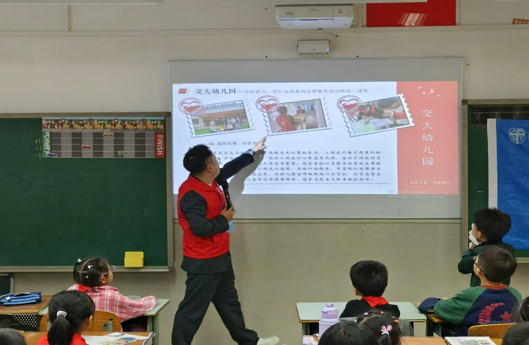 来到益州小学二年级十三班的课堂,陈建奇首先向小朋友们介绍了团队的成员以及经管青协的组织架构和概况,其中涵盖了各个部门的具体介绍及其职责,还包括阳光家园、敬老院、善工家园、交大幼儿园等志愿服务基地,以及爱心雨伞、旧衣回收、阳光义卖等青协品牌活动。随后,陈建奇对青鸽志愿服务队进行了介绍:“青鸽志愿服务队是色色啦