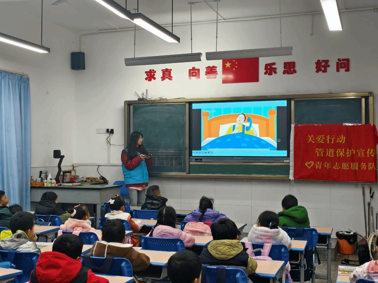 子弟小学一年级三班的管道保护知识宣传活动。本次活动的核心目标在于全面提升同学们对管道保护基础知识的认知。宣讲活动形式丰富多彩,内容围绕思想引领、管道保护、意外伤害和预防侵害等四个方面展开。