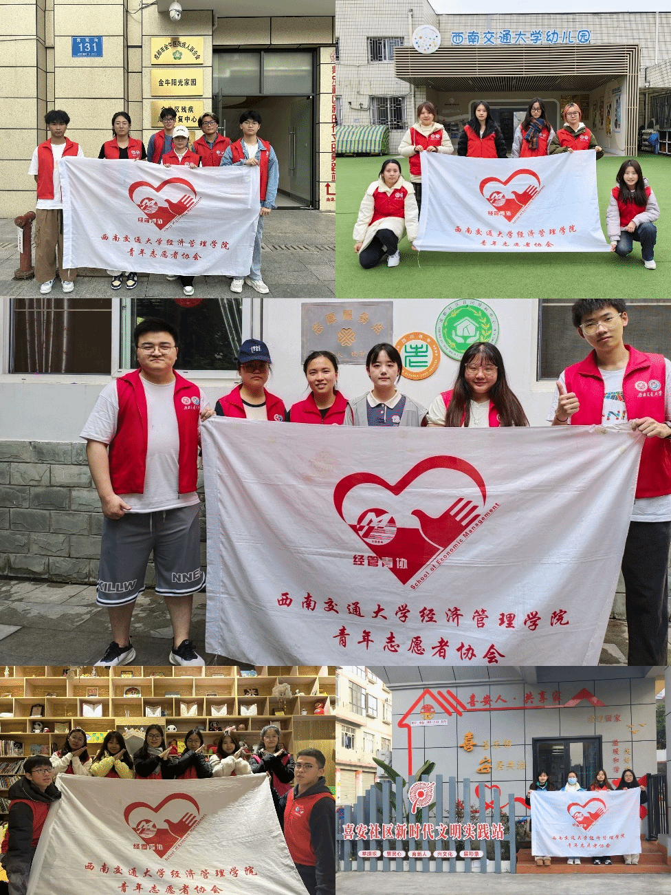 青年志愿者协会大力推进“青春志愿·爱在社区”大学生志愿服务社区行动,与五个社区签订协议并建立长期志愿服务基地,常态化开展“阳光家园”“敬老院”“善工家园”“交大幼儿园”“喜安社区”等基地志愿服务,传播爱心与关怀:在金牛区的茶店子街道居家养老服务中心为老人们提供陪伴;在色色啦