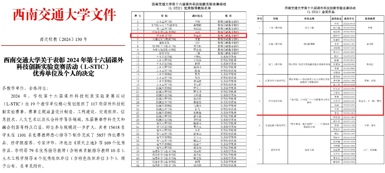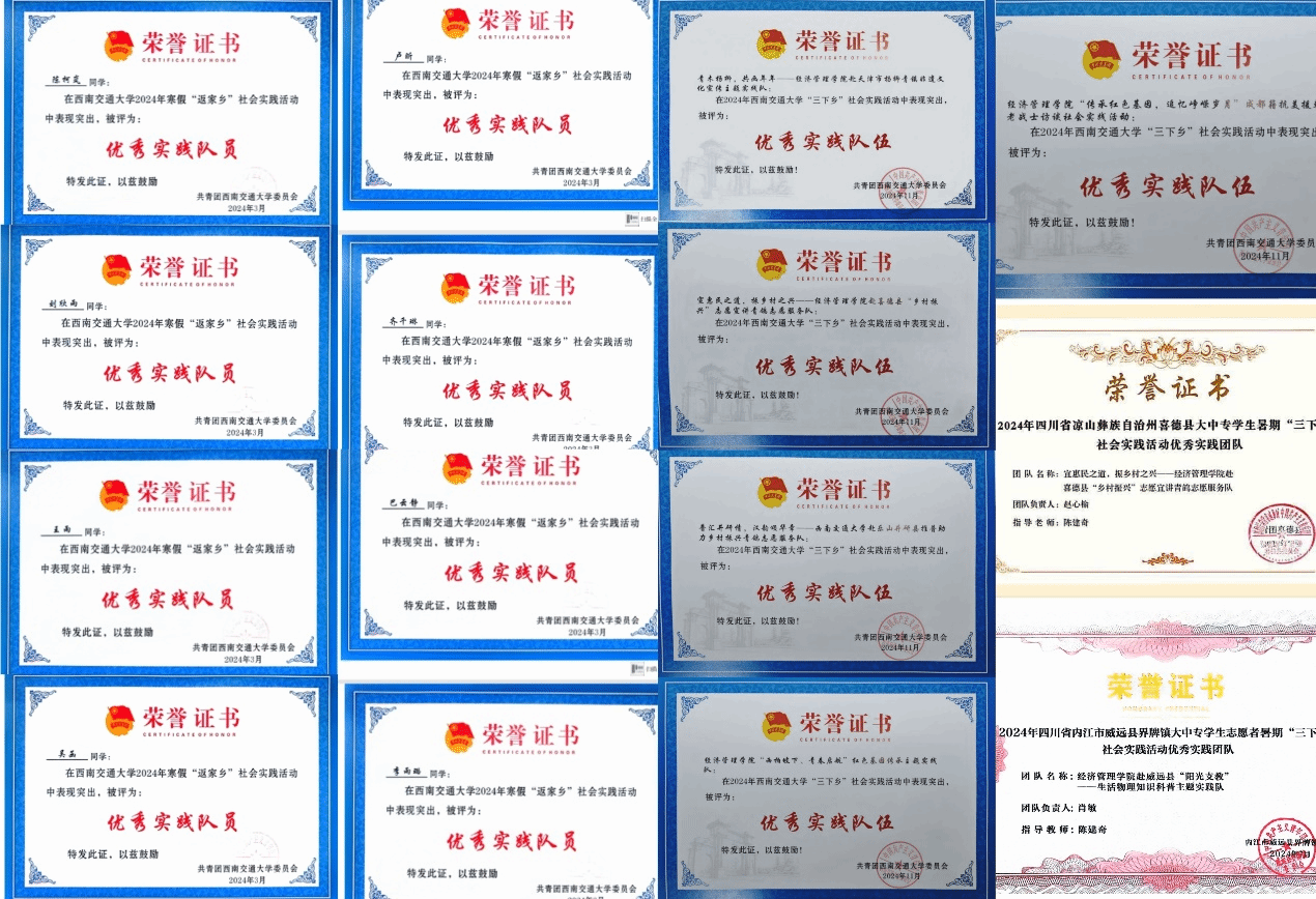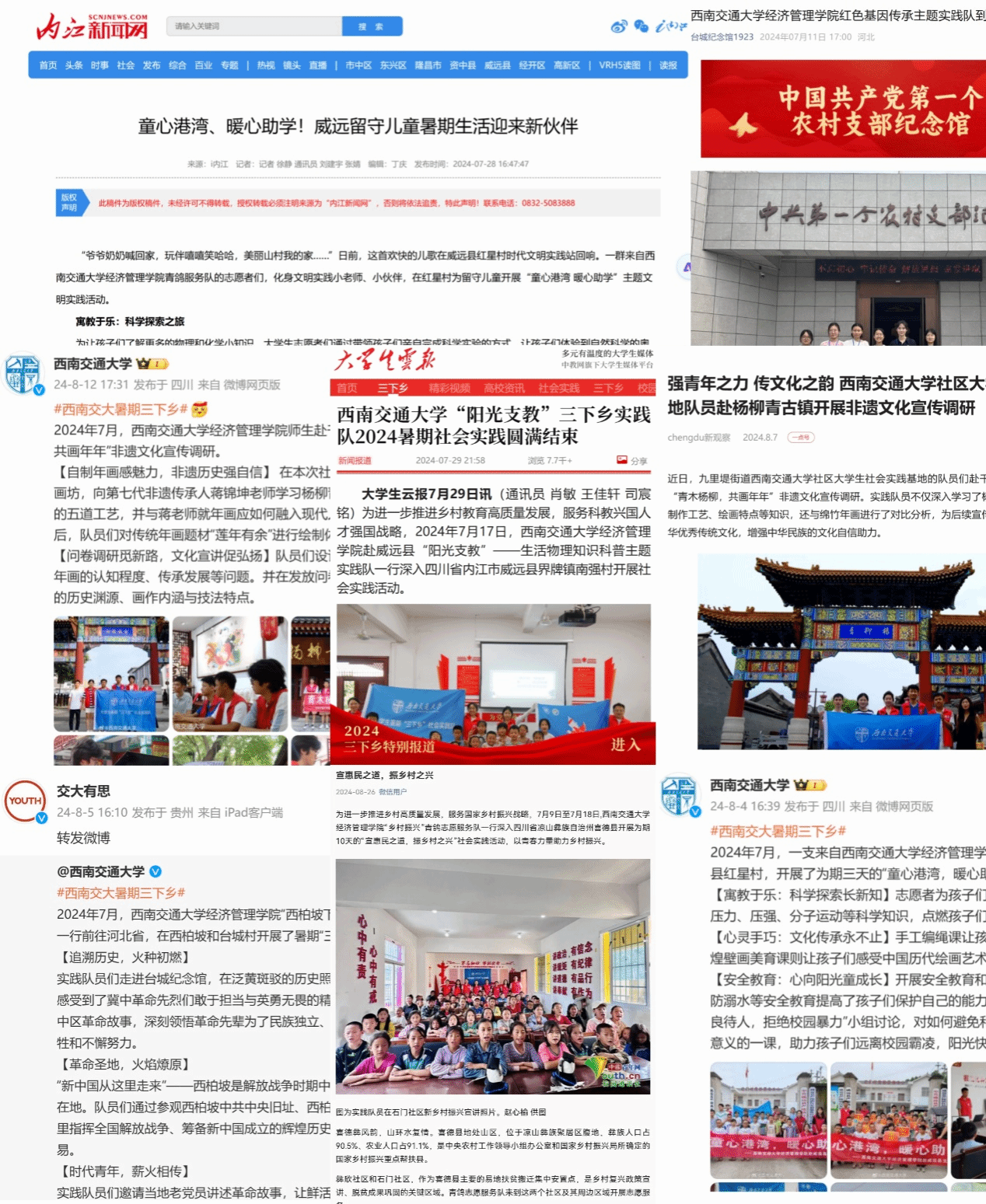 学院8支队伍获评学校寒、暑假社会实践优秀队伍,36名同学获优秀实践队员,6名老师获学校共青团实践育人优秀指导教师,收到实践地反馈信、感谢信共计20余份。实践队伍获中青校园、中国大学生网、今日头条、中国共青团官方杂志、“三下乡”官方微博等国家级报道40篇,四川法制报、四川学联、四川共青团官方微博等省级媒体报道11篇,县、市级等其他报道总计81篇。实践活动受到了社会的广泛关注,取得了积极的社会影响。同时,总结、表彰、宣传,树立典型,强化我院实践育人成效,先后发布我院实践队伍风采展新闻及推送6篇,展现了交大经管学子的良好风貌。