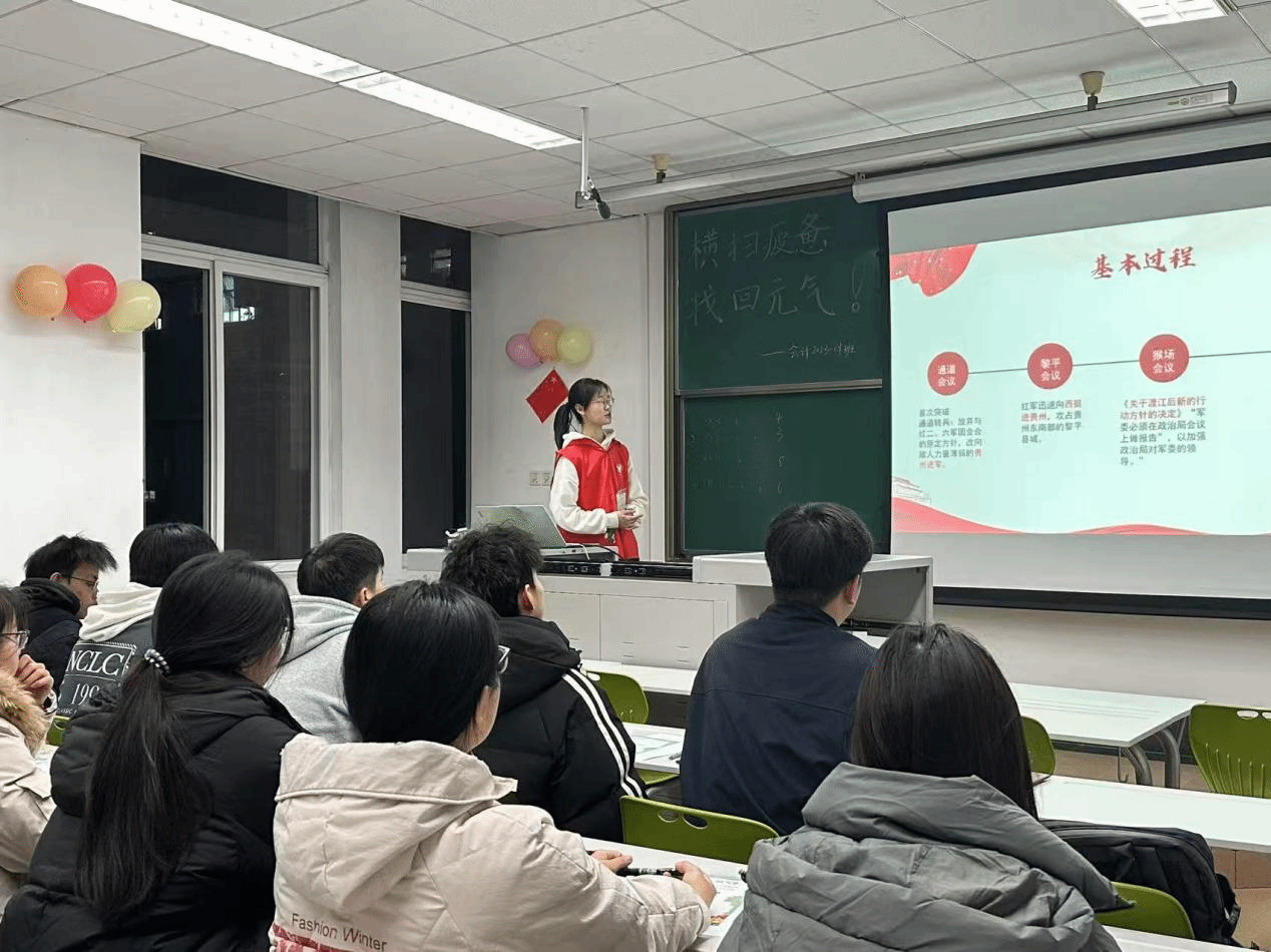活动中,主讲人以充沛的感情讲述了遵义会议期间革命先辈的光辉事迹,生动展现了老一辈革命家如何在艰难的条件下,矢志不渝坚持真理、勇于修正自身错误,最终带领中国革命走向胜利的壮丽历程。从会议召开的历史背景,到遵义会议对中国革命进程产生的深远影响,主讲人将这些故事娓娓道来,为同学们带来了一场别开生面的宣讲活动。