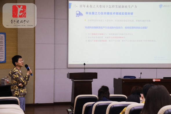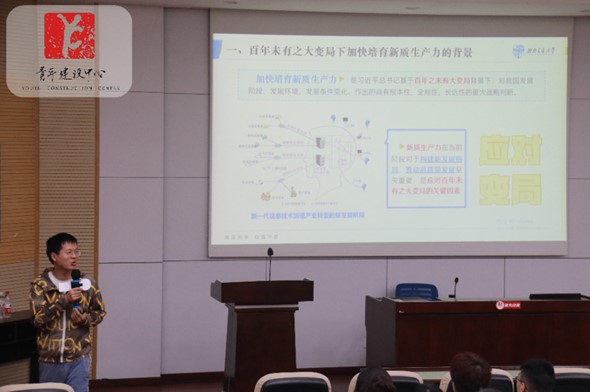 “理响红途”理论宣讲团成员唐斌主讲,主题为“百年未有之大变局下加快培育新质生产力的重要意义”,旨在帮助团干部们明晰加快培育新质生产力的时代背景及其重要意义。