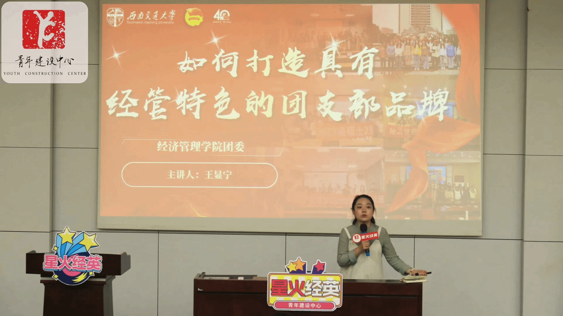 硕士2023级第2团支部书记王显宁主讲,主题为“如何建设具有经管特色的团支部品牌”,旨在提升团干部的综合素养和工作能力,指明团支部品牌建设的方向。