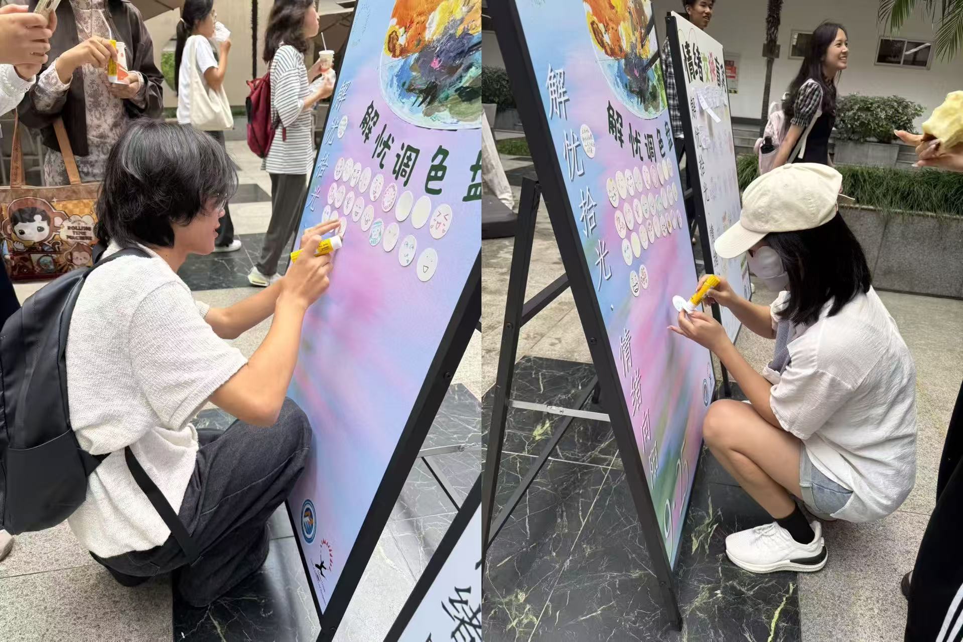 在“解忧调色盘”区域,同学们领取便签纸和彩笔,通过绘画将自己的情绪尽情展现,完成的作品被贴在展板上,汇聚成一幅生动的“解忧地图”,供大家相互交流、分享创意。