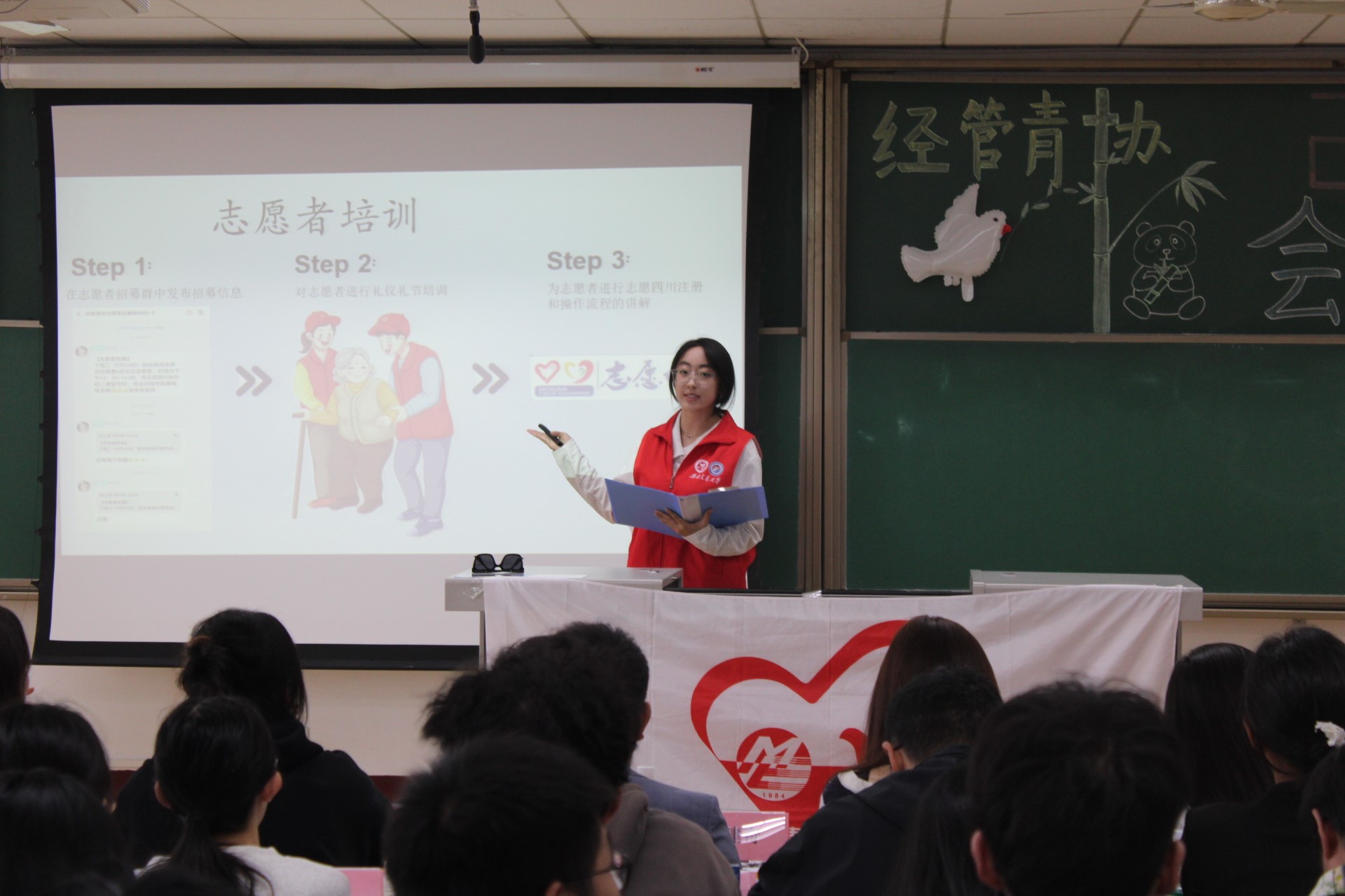 在文艺展演的间隙,各部门的专业宣讲也为新成员搭建起了解志愿工作的桥梁。外联部详解西南交大幼儿园、敬老院等五大志愿基地的特色服务,勾勒青协服务社会的版图;活动部细致讲解“志愿四川”操作流程,解读星级志愿者评定细则,为成员志愿之路指明方向;实践考核部介绍“三下乡”“返家乡”社会实践与“交通·公益”大赛,鼓励成员在实践中锤炼本领。专业的讲解与实用的指导,让新成员对未来的志愿工作充满期待。