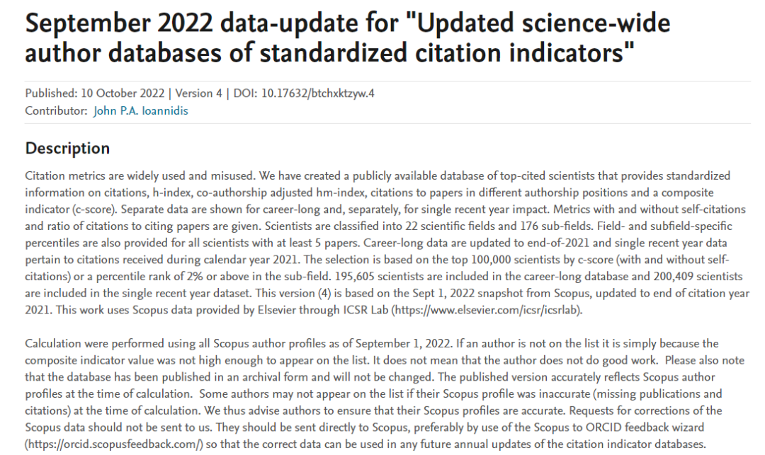 斯坦福大学John P. A. Ioannidis教授团队于2019年7月发布“年度科学影响力排行榜”和“终身科学影响力排行榜”第一版,2022年是第四版,发布时间为2022年10月10日,统计数据时间节点为1960-2022年,涵盖全球200,409位科学家。该榜单基于Scopus数据库,使用了六种关键因素的指标来进行打分:1)总引用量;2)Hirsch H-index;3)共同作者修正的Schreiber Hm-index;4)单独作者;5)单独或者第一作者;6)单独、第一或者最后作者的文章引用量。