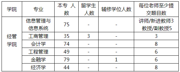 4.本次题目按各系学生人数来划分最低提交数,各位老师可参考下表,老师可以在保障所要求的最低题目数量的基础上,可多提交题目,以给学生更多的选择。按教务处要求,原则上每位老师可最多指导10名学生,本届有辅修学位的学生参加毕业设计(论文)环节。
