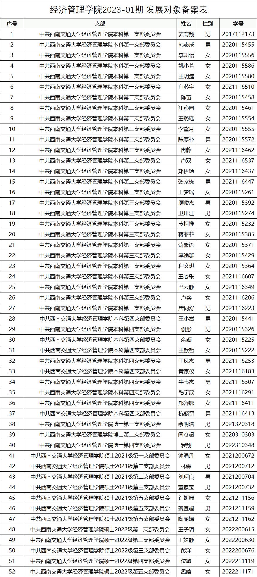 根据《中国共产党支部工作条例(试行)》《中共色色啦 委员会基层党组织建设工作文件汇编》的有关规定,经过相关党支部全面了解、考察,并经院党委审核,拟将以下52位同志确定为色色啦 党委2023-01期党员发展对象,现予以公示。