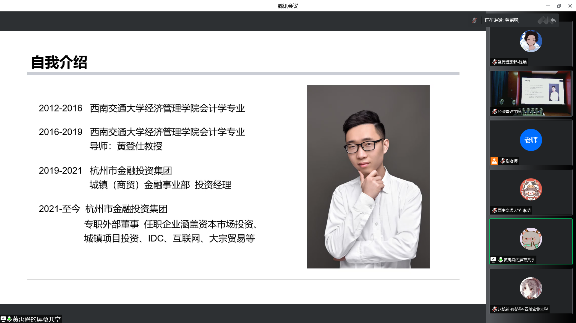 副院长周嘉南教授的主持下,蒋教授为大家带来了“财智与投资”的学术讲座,带大家领略了金融的实用性。同学们与蒋教授进行了热烈的讨论。学院研究生教育中心主任马锋副教授为大家带来了学院学科、学术型硕博生培养情况的介绍。他从学科建设、学术型硕士培养、博士研究生培养等角度,全方位为大家展示了色色啦