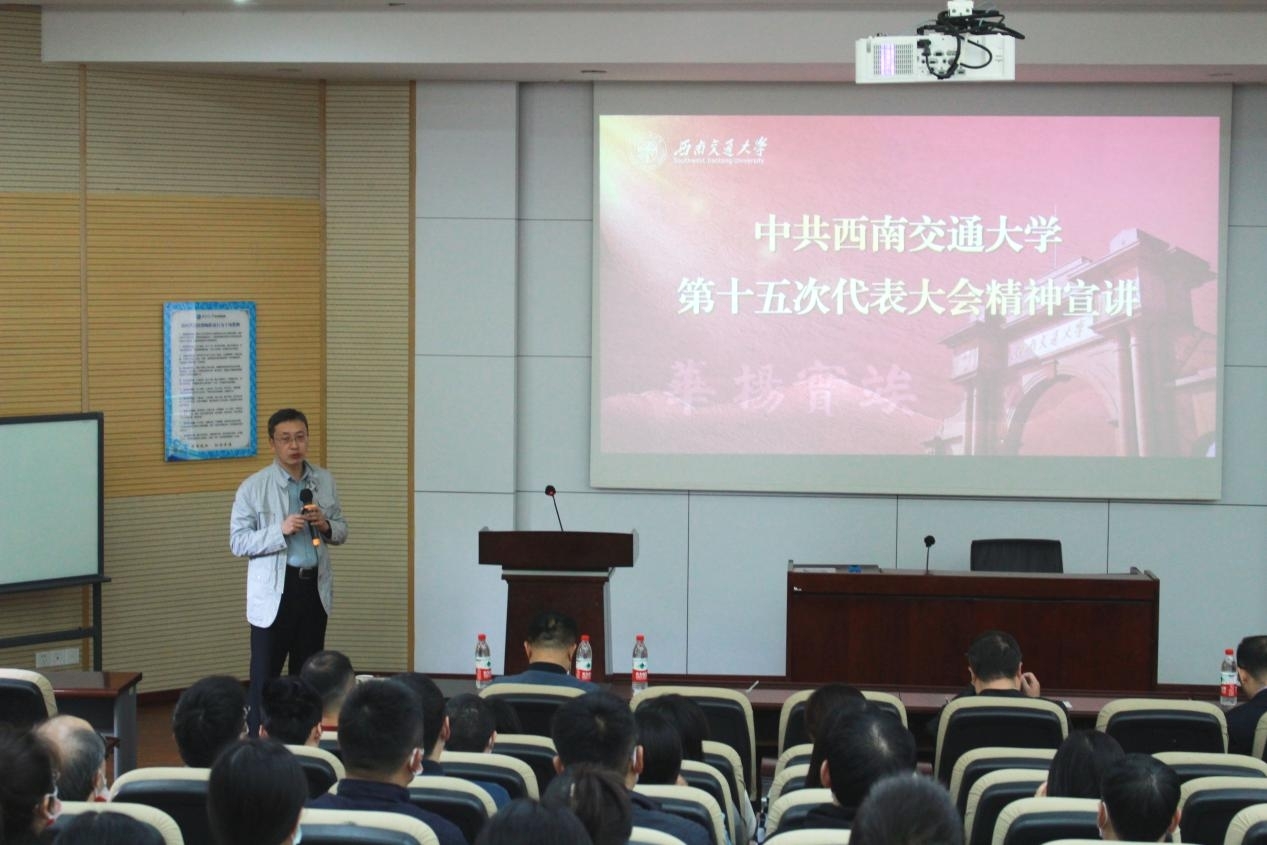 第二阶段,集体学习领会学校第十五次党代会精神。王斌带领与会教职工从学校第十五次党代会的基本概况、深刻认识第十五次党代会的重要意义、精准把握第十五次党代会的主要精神、全面加强党的建设和思想政治工作等方面进行了学习,重点带领大家学习领会了大会的主题、“五个着力建设”总体办学思路、“建设交通特色鲜明的世界一流大学”总目标、“三步走”战略安排、“五个必须坚持”办学治校基本准则,以及“谋发展、建一流,惠民生、聚民心,强化支撑与保障”三条实践途径等的内容和精神。王斌指出,全院教职工要将党的二十大精神和学校第十五次党代会精神有机结合,深入学习、深刻领会,全面推动党的二十大精神和学校第十五次党代会精神落实落地。