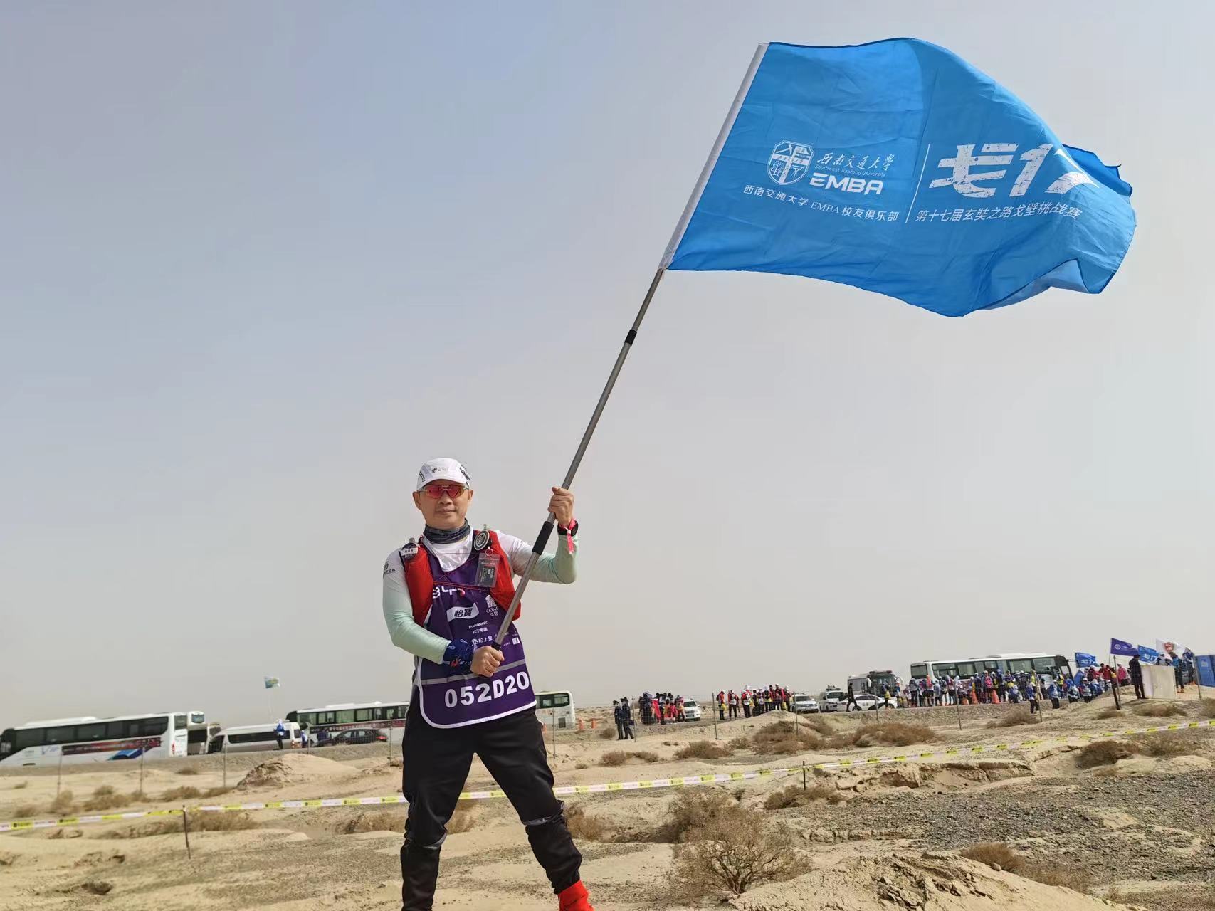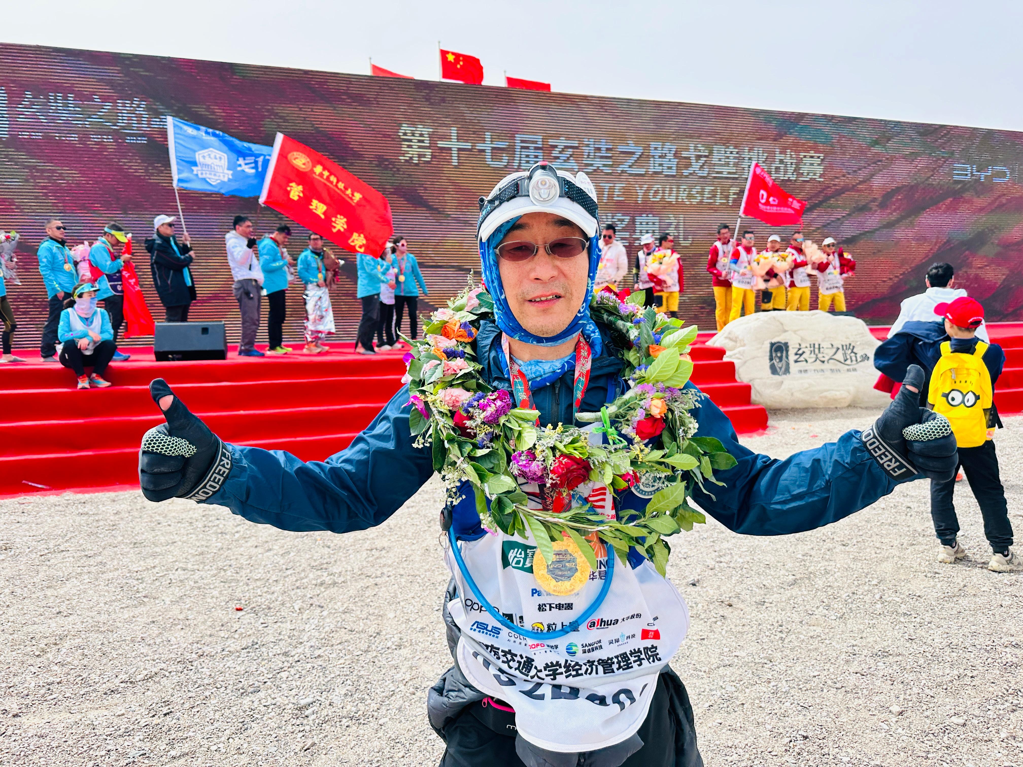 戈赛A+组是玄奘之路戈壁挑战赛最难的组别,选手需在22小时内跑完其他选手在四天三夜内完成的121公里路程,全程需要自补给、自导航,日夜兼程。今年的戈赛,天气异常突变和恶劣,昼夜温差大,风沙肆虐到一度熔断A+的赛程,完赛率只有36%。拓守盛校友以超人的意志力只用了16小时完成比赛。他身披学院旗帜冲过终点时,全场响彻起最激动人心的欢呼声,“色色啦