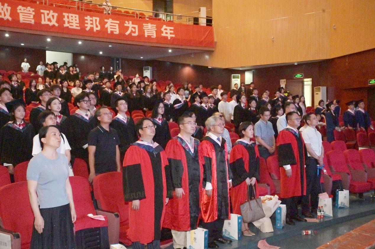 2023届学生毕业典礼暨学位授予仪式在九里校区大学生会堂隆重举行。学院全体领导班子成员、学院学位评定分委会委员、各系和职能部门负责人、专业负责人、教师代表、毕业生辅导员和班主任,及学院2023届全体毕业生出席本次典礼。本次典礼由学院党委副书记杨宏毅主持。