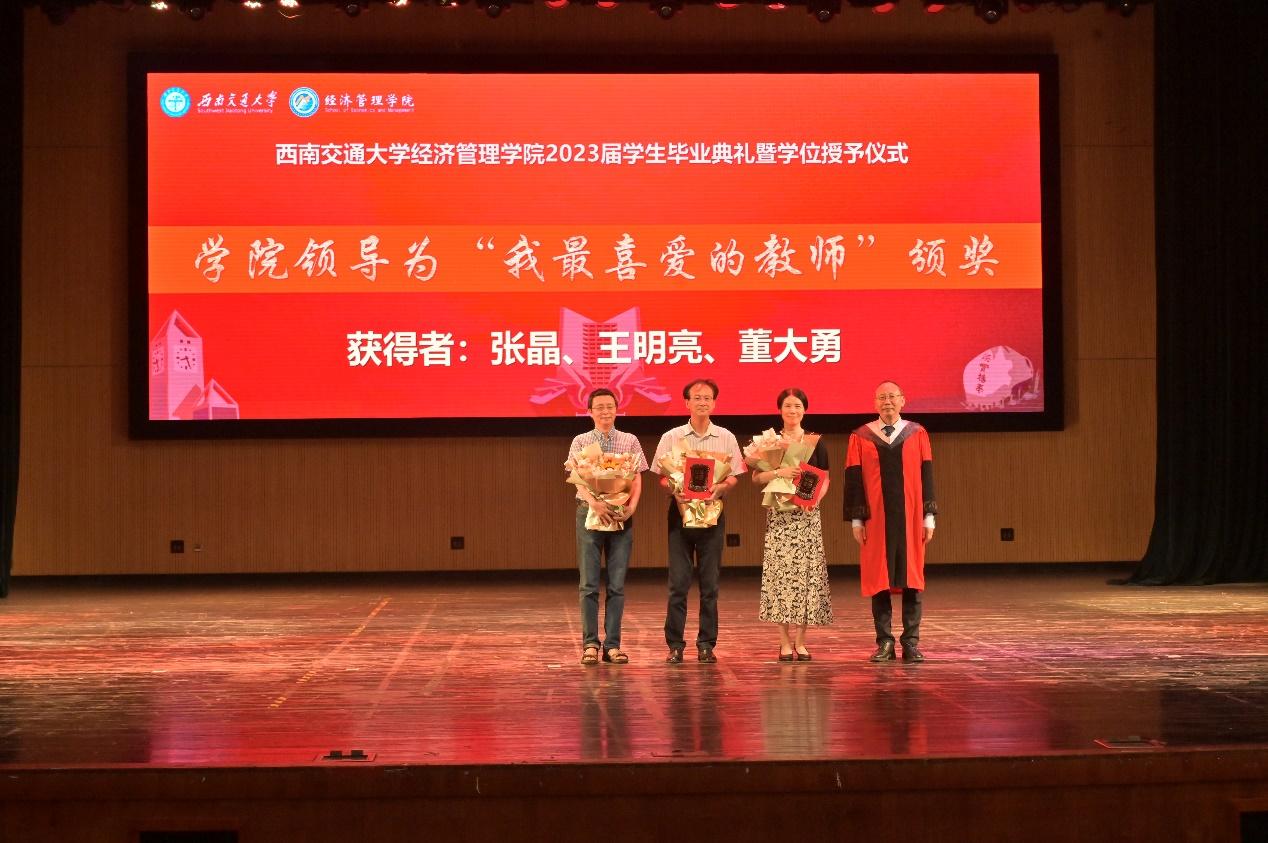 学院副院长李良宣读我院2023届本科毕业生评选的“我最喜爱的教师”名单,获得者是:张晶老师、王明亮老师、董大勇老师,并由王明亮老师作为教师代表为2023届毕业生致临别寄语。他在发言中,回顾了与同学们共同走过的39年风风雨雨,分享了陪伴同学们成长的点点滴滴,希望同学们在将来仍要积极努力,一定要做一个对社会、对集体、对家庭有责任感的人,彰显我们交大经管新青年的大格局、大情怀、大担当。