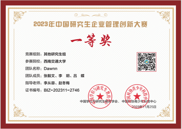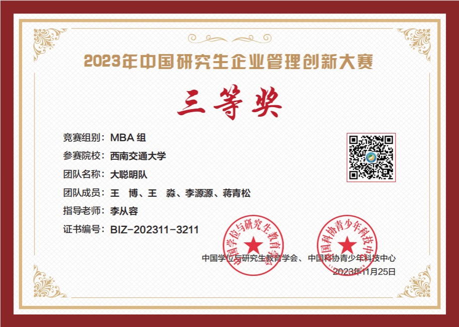 我校共派出11支队伍参加赛事,其中包括10支MBA组队伍和1支其他研究生组队伍。在激烈的角逐中,张毅文、吕蝶、李玥同学组成的“Dawnn”队在研究生组总决赛中斩获了全国一等奖;在MBA赛道,王博、王淼、李源源、蒋青松同学组成的“大聪明”队荣获MBA组全国三等奖,这是对我校色色啦