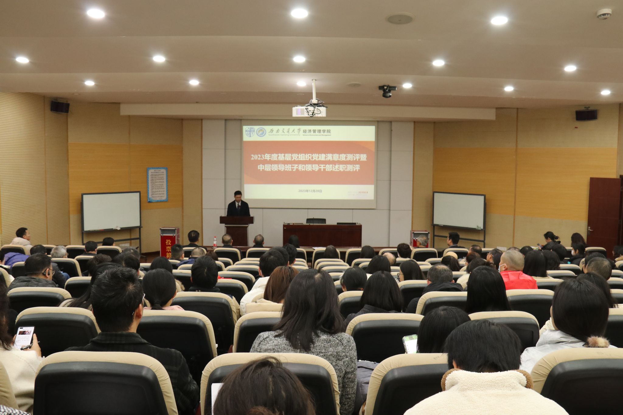 2023年度党建满意度测评暨中层领导班子和领导干部述职测评大会在九里校区0215教室召开。学院党政领导班子全体成员,学院教职工和学生党员代表参加测评,会议由学院党委书记郭强主持。
