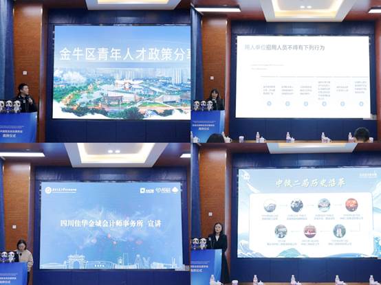 金牛区相关工作人员对区情及人才引进、大学生就业劳动关系相关政策进行宣讲,中铁二局、四川佳华金城会计师事务所对人才引进与培养体系进行了宣讲,充分为大学生提供企业信息和就业机会。