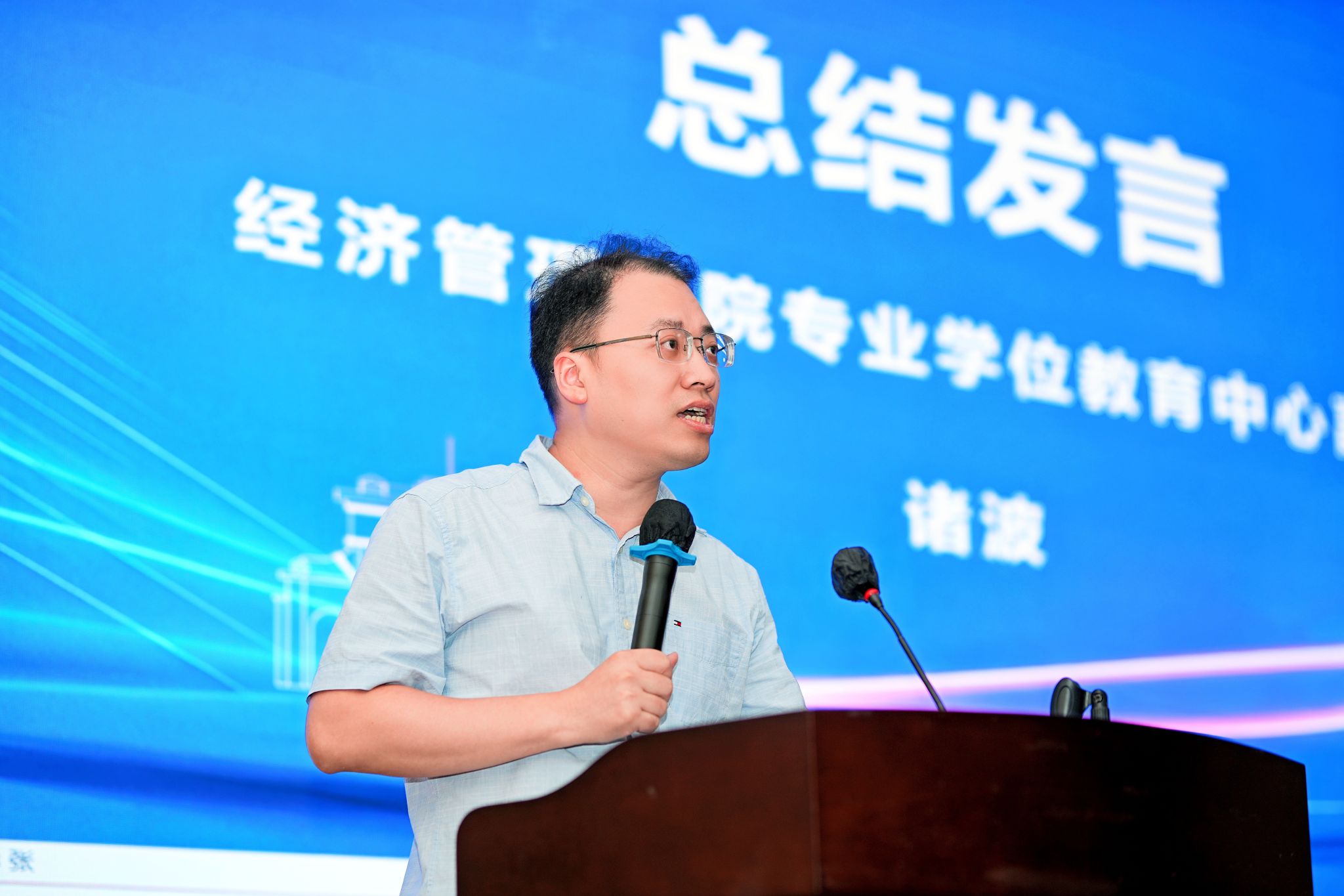 最后专业学位教育中心副主任诸波做总结讲话,本届大赛不仅是对MBA/EMBA教学成果的检阅,更是产教融合的生动实践。通过真实企业案例的剖析,同学们得以将课堂知识转化为解决实际问题的能力,这正是MBA/EMBA教育的核心价值。他提出,赛事全程模拟商业实战场景,从资料搜集到方案落地,全方位锻炼了同学们的战略思维与团队协作能力。“案例大赛不仅是知识的竞技场,更是思想的熔炉。同学们在比赛中展现出的批判性思维与创新精神,正是新时代商科人才的核心竞争力。”
