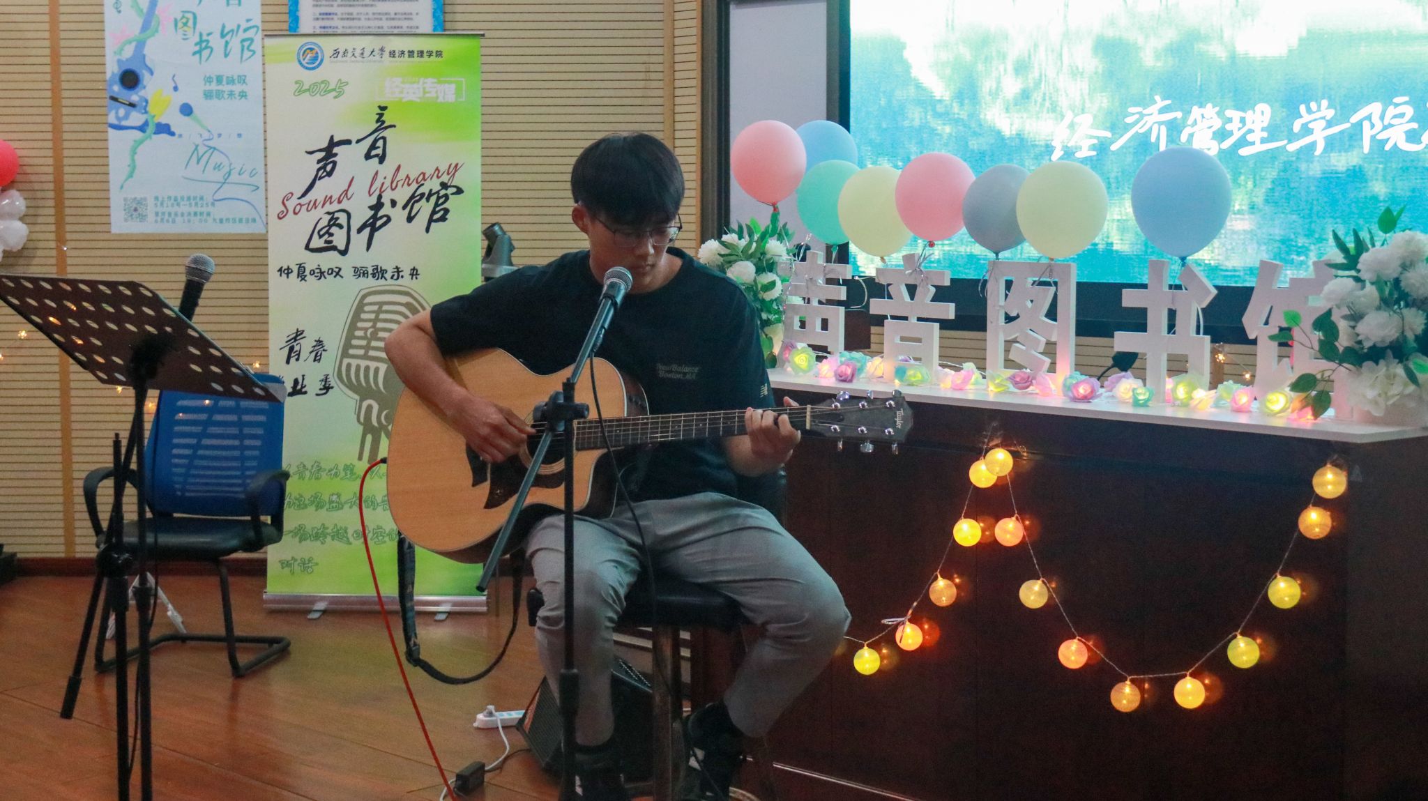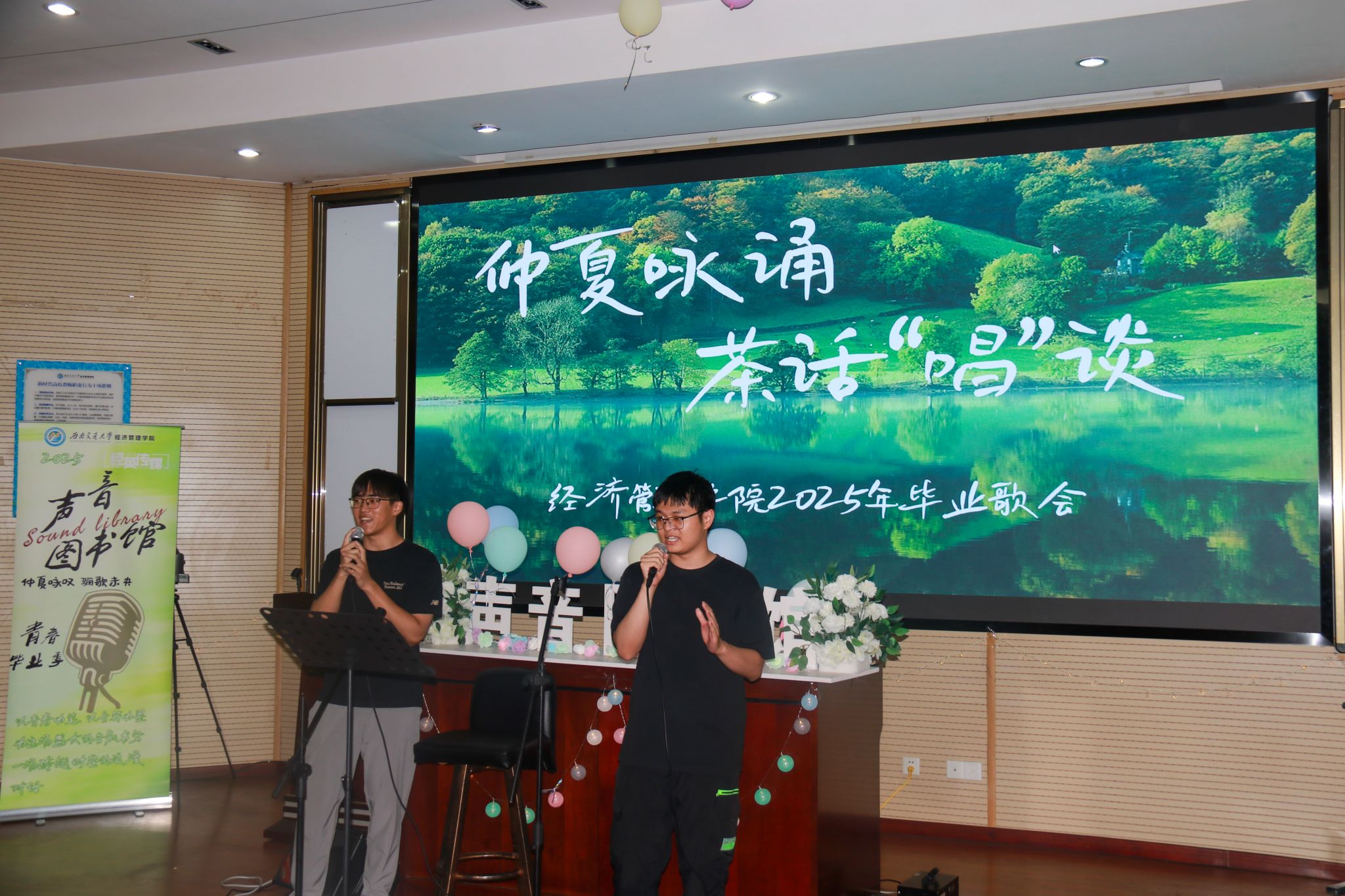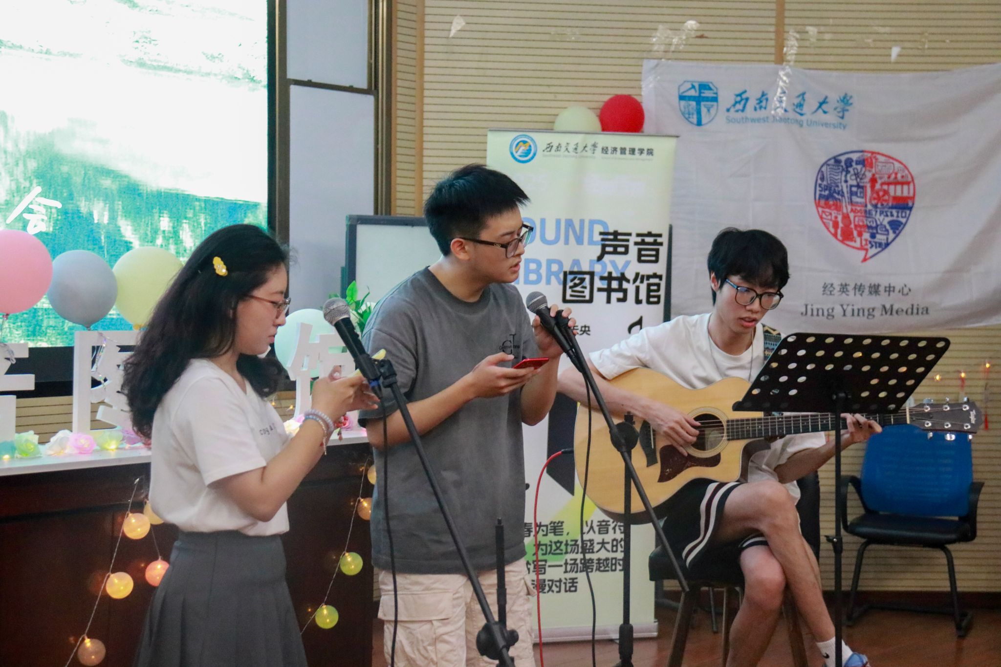 党委书记蒋佳,党委副书记余小英,交大之声台长万玘玥,学院辅导员老师与学院同学们在音乐里共话情谊。