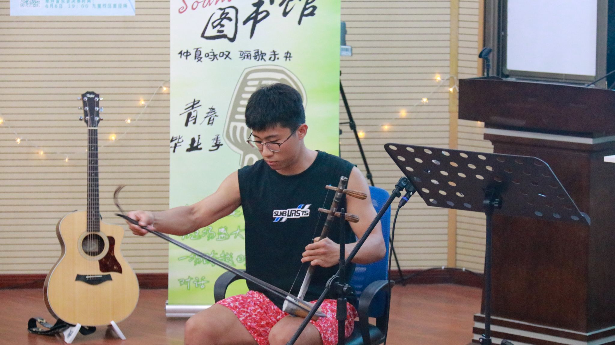 声音为翼,夏日与青春的交响乐在此翱翔,同学们用乐器、声线、歌喉带我们走进美、感受美。孙啸天用京胡演奏《夜深沉》,带着我们感受传统乐器与现代节奏的碰撞;张涵琪将用《乌兰巴托的夜》带我们领略夜色下乌兰巴托的苍茫;张嘉盛将用一把吉他、一副嗓音、一首《她来听我的演唱会》,让现场感受到关于聆听与陪伴的浪漫……卸下时光之尘,让心底久藏的情愫纵情流淌,声声铿锵,字字饱蘸光芒。
