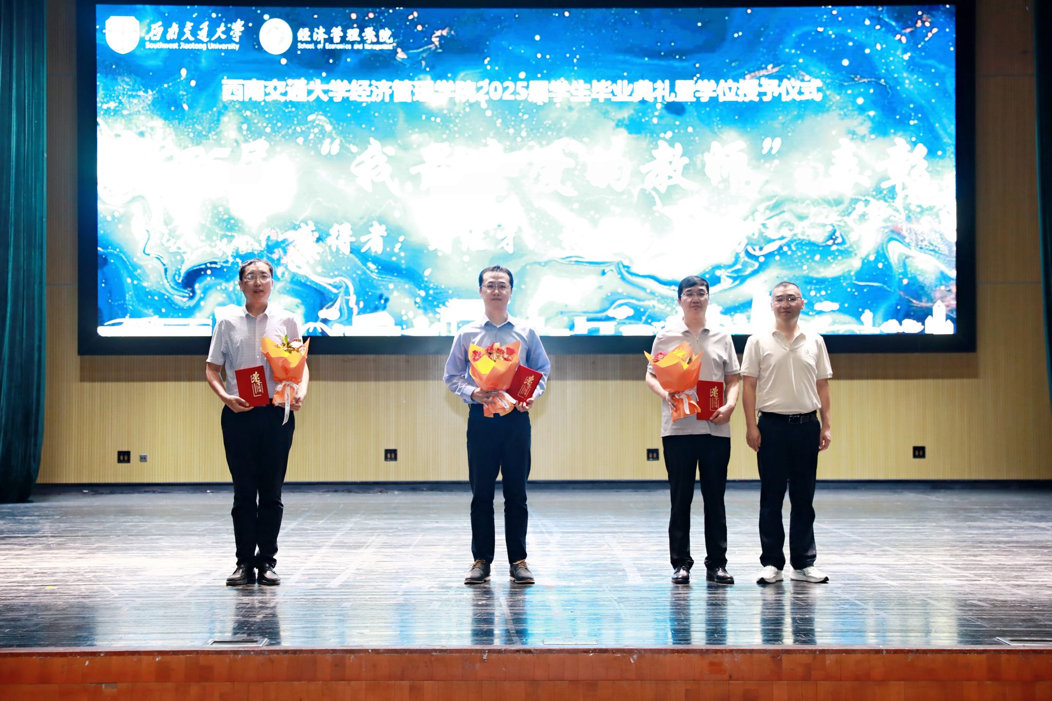 学院院长韩科宣读2025届本科毕业生“我最喜爱的教师”获奖名单,获奖老师是刘继才、林楚彬、叶勇,学院副院长聂佳佳为三位老师颁奖。
