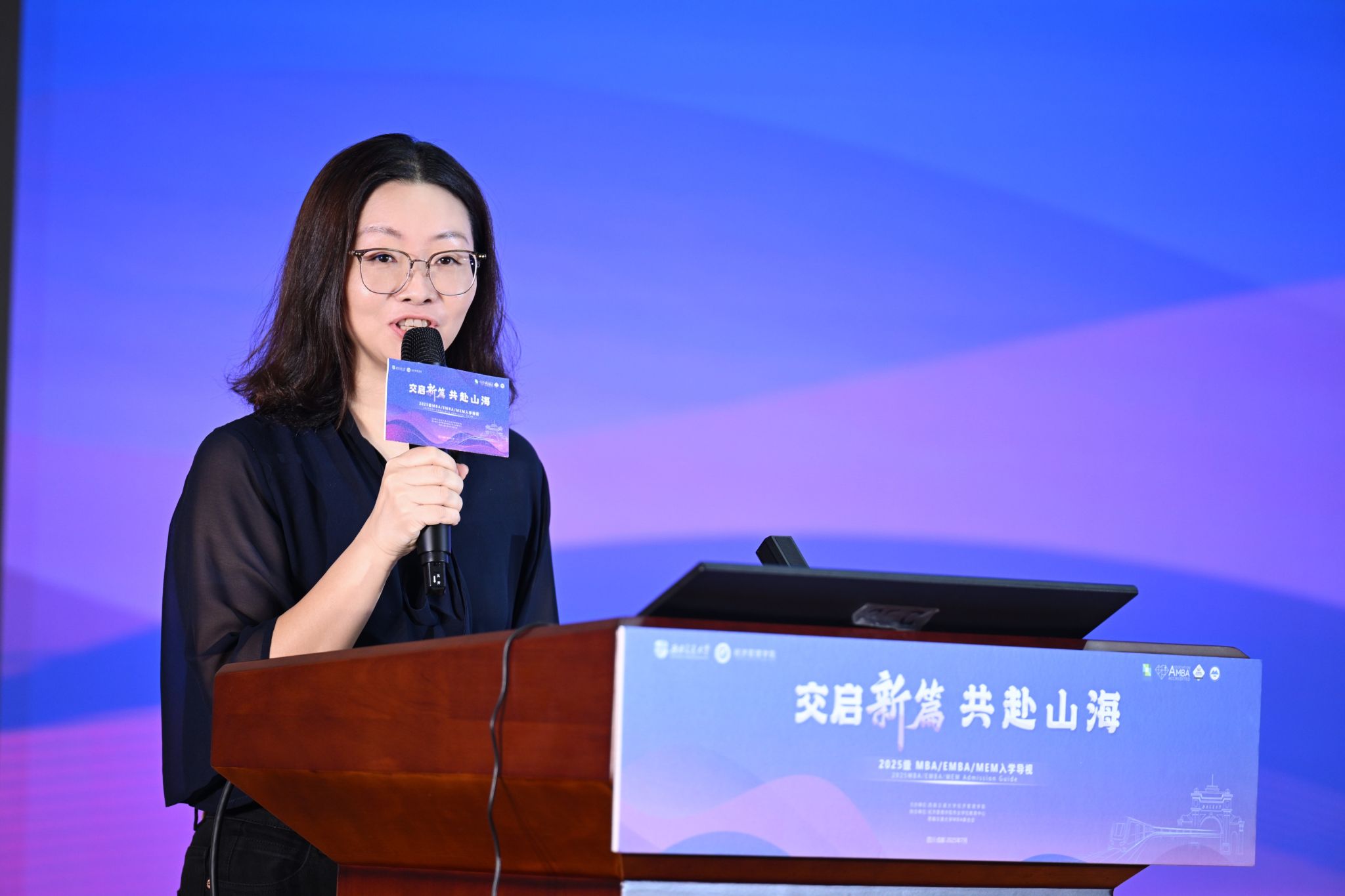 紧接着,MBA联合会副主席王汝超介绍了7个社团的创立理念及活动开展情况,鼓励新生踊跃加入。她指出,参加社团能丰富课余生活,开拓视野,还能结交志同道合的朋友,助力个人成长与未来发展。MBA联合会副主席刘林介绍了沙漠挑战赛,EMBA学长周鹏介绍了戈壁挑战赛,他们回顾了交大学子在历届比赛中的征程与佳绩,分享了参赛感受,并呼吁2025级同学积极参与拼搏,展现交大人“自强不息”的精神。
