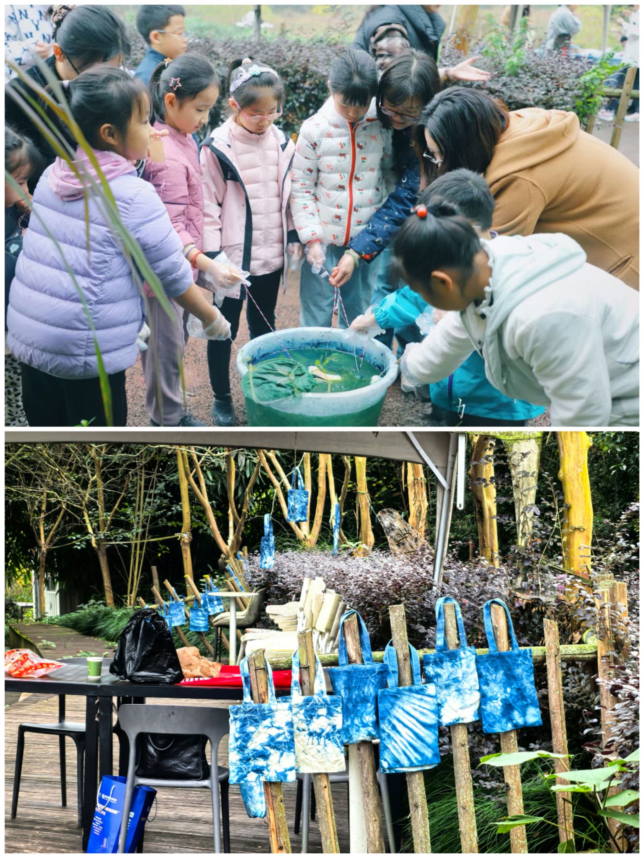 活动中,大家在农场老师的引导下,共同体验了传统非遗扎染艺术。孩子们认真聆听老师讲解扎染的基本知识,了解扎染捆扎的基本方法,学习螺旋纹、云纹、鱼鳞纹等图案的捆扎技巧。随后,大家纷纷动手,发挥创意,通过绑扎、浸染、清洗、风干等步骤,完成了各具特色的扎染小包作品,深刻感受到传统手工艺的独特魅力。