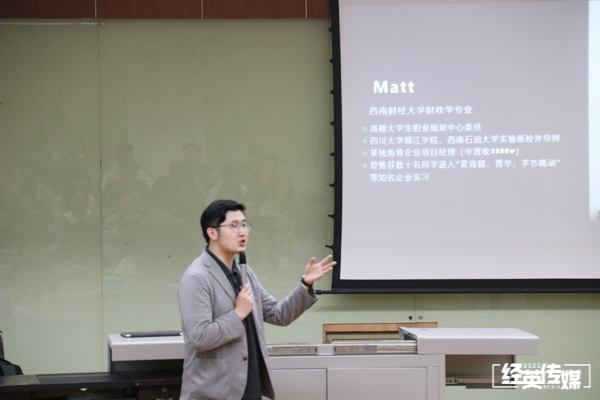讲座伊始,Matt老师以“你的优势是什么”这一问题切入,引导同学们思考自我,点明大学生涯规划的重要性。通过Matt老师的讲解,同学们了解到:职业生涯规划对于每一位大学生而言,是在对自我有清晰认知的基础上,以自身专业特长、知识结构为参考,结合当下社会与市场环境和未来发展趋势,为将来要从事的职业以及要达到的职业目标做出具有指引性的方案。Matt老师引经据典,以大量的实际案例告诉同学们:身为大学生,应对生涯规划引起重视,更应认真了解并去主动创造自身优势,借助更专业的平台,成就更优秀的自己。