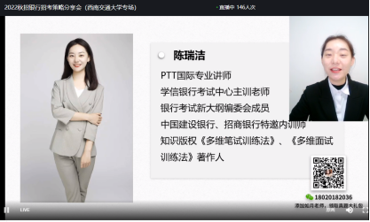 本次分享会由学信银行考试中心专业培训师、工商银行与建设银行特邀内训师、《银行考试新大纲》编委会委员陈瑞洁老师主讲。会议伊始,陈老师对银行招聘进行了概述,其中包括银行就业前景、招聘时间、招聘流程等。陈老师指出,银行业在中国金融业中处于主体地位,是金融行业最为人熟知,也是最为稳定的行业,进入银行意味着将有更多机会去接触高端金融行业。听了陈老师富有感染力的讲说,即使隔着屏幕,学子们也跃跃欲试。接下来,陈老师分别从网申、笔试、面试三个方面进行了详细的技巧分享。
