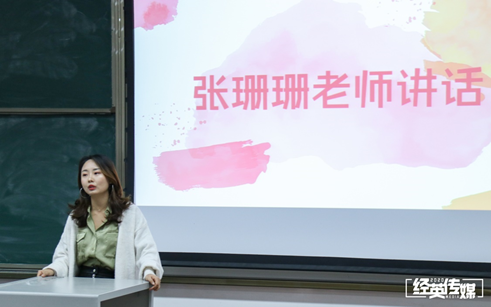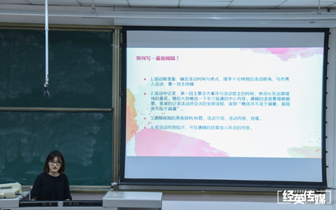 随后,由经英传媒中心采编部赵哲为同学们讲解如何写一篇规范的新闻稿。她的讲解主要分为三个部分:什么是新闻稿、如何写一篇新闻稿、如何使一篇稿件更规范。在介绍如何使一篇新闻稿更规范时,她分别从新闻写作内容、写作格式、写作注意事项为同学们带来讲解,并为同学们解释了如何在色色啦