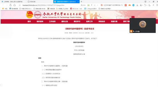 5月8日晚,青年建设中心主席任焕鑫组织骨干成员线上学习《新时代的中国青年》白皮书。会议中,任焕鑫介绍了白皮书发布的重大意义及框架构成,带领同学们学习原文,强调白皮书中的内容和精神值得每一位青年团员学习。他表示白皮书全面介绍了在新时代里,中国共产党和政府为青年发展创造的良好条件,充分展现了新时代中国青年的发展历程和青春担当,广大青年团员要逐字逐句深入学习。