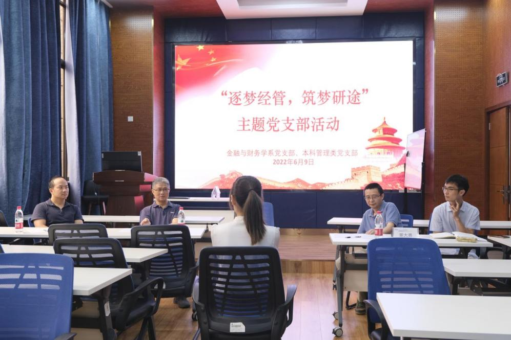 2022年6月9日下午,金融与财务学系党支部与本科管理类党支部于J0218共同举办“逐梦经管,筑梦研途”主题党支部活动。本次活动由金融与财务学系党支部书记马锋老师指导开展,以研究生升学模拟面试为主,邀请到学院党委委员李良副院长、党委委员周嘉南副院长、朱宏泉教授、董大勇副教授、郭姝辛老师、户晗蕾老师、梁超老师、许自坚老师参与和指导。