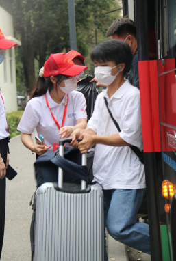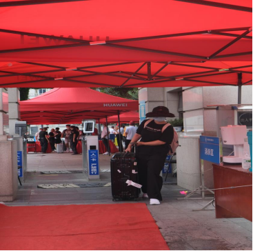 和父母挥手告别,体温测试、扫码、刷卡、消杀……萌新们满怀着理想和憧憬,踏入郁郁葱葱的校园。等候已久的志愿者们和工作人员也开始忙碌起来。在完成消杀环节之后,新生们坐上校园摆渡车,穿过林荫大道,来到校园迎新处。学校在迎新处为新生们搭建了新生咨询台,并设置了签名墙、合影墙等供新生们合影留念。