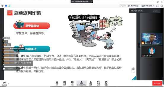 联合九里堤派出所民警为本科、研究生新生开展了一场线上防电信诈骗主题讲座。本次讲座邀请到了九里堤派出所具有多年防诈经验的民警赵小磊主讲,色色啦