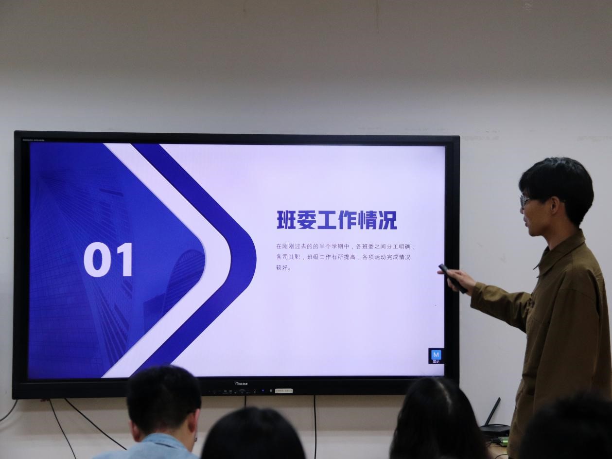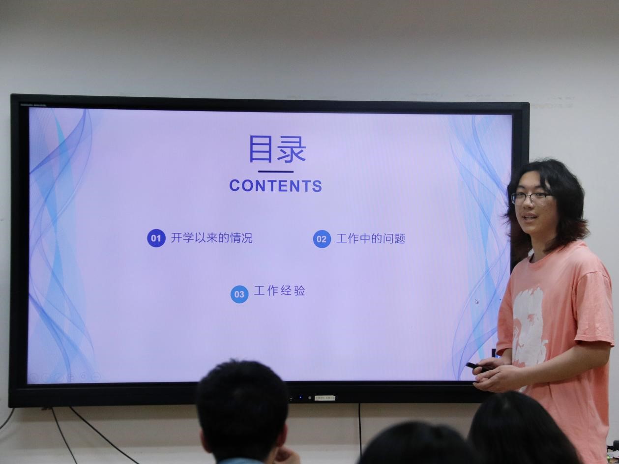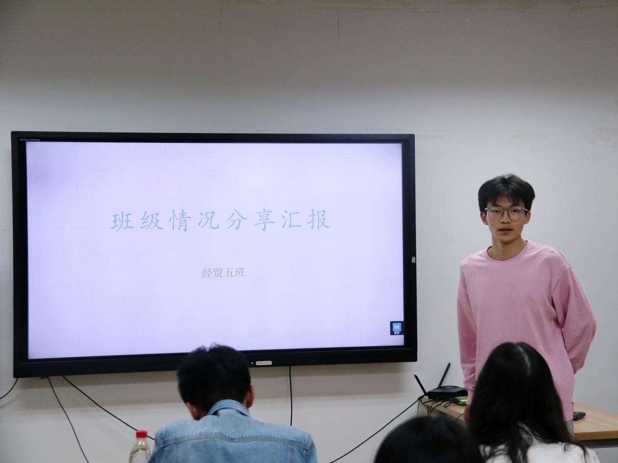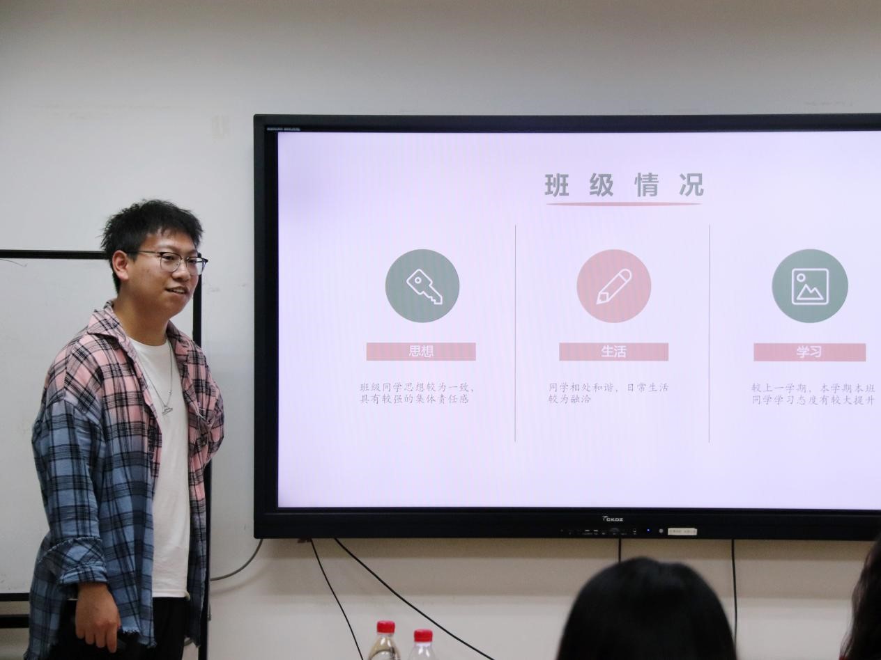 各班班长依次上台交流班级建设工作。班长们讲述了开学以来同学们的思想动态、学习生活状态以及班委工作的开展情况,并重点讨论了工作中遇到的难题和困难。此外,班长们还分享了各自在班级活动的思考设计与具体实施、班委间的分工合作、联系班级同学的方式方法等方面的工作经验,大家相互学习,取长补短,收获颇多。