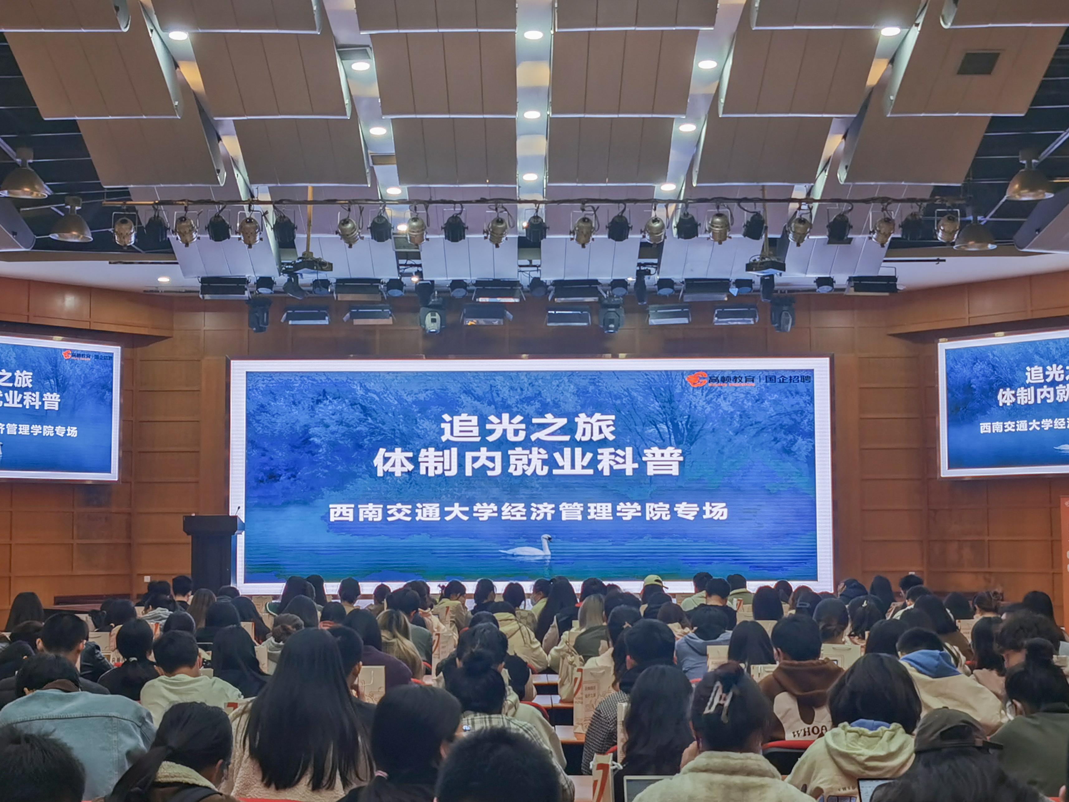 在九里校区国际会议厅开展了体制内就业科普讲座。本次讲座邀请了高顿教育的樊磊老师作为讲师。樊磊老师讲解了国有六大行、三大政策行、石油、烟草、三大运营商等国有企业的招聘时间、具体招聘要求及招聘流程,帮助同学们破除信息差。同时他呼吁同学们自信展示自身优势,增强竞争力。
