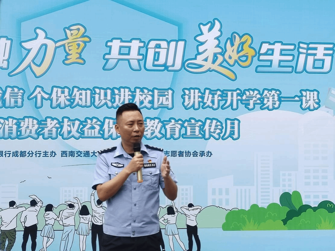 出席本次活动的嘉宾有经济管理学院党委副书记、学生工作组组长杨宏毅,学院团委副书记、青年志愿者协会指导老师陈建奇,浦发银行和中国人民银行成都分行的工作人员,此外,活动还特别邀请到成都市公安局金牛区反诈联席办警官。中午12点45分活动正式开始,主持人对到场的各位嘉宾做了简要介绍,并对参与活动的同学们表示热烈欢迎。随后,杨宏毅进行了致辞,他表达了对本次活动的认可与支持,希望通过此次活动让大家了解反洗钱、反诈拒赌、征信、个人信息保护、个人金融信息等金融知识,提升广大学生群体金融素养,提高反诈、识诈意识和能力。