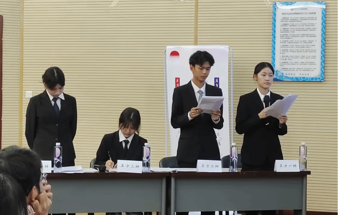 辩论队指导老师、2023级辅导员苏扬受邀出席,校辩论队队长、各院辩论队队长及学院各学生组织负责人担任现场评委,同时现场有两百余名观众前来观赛。