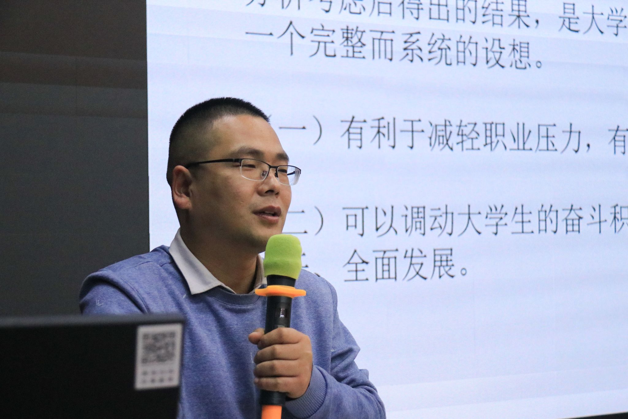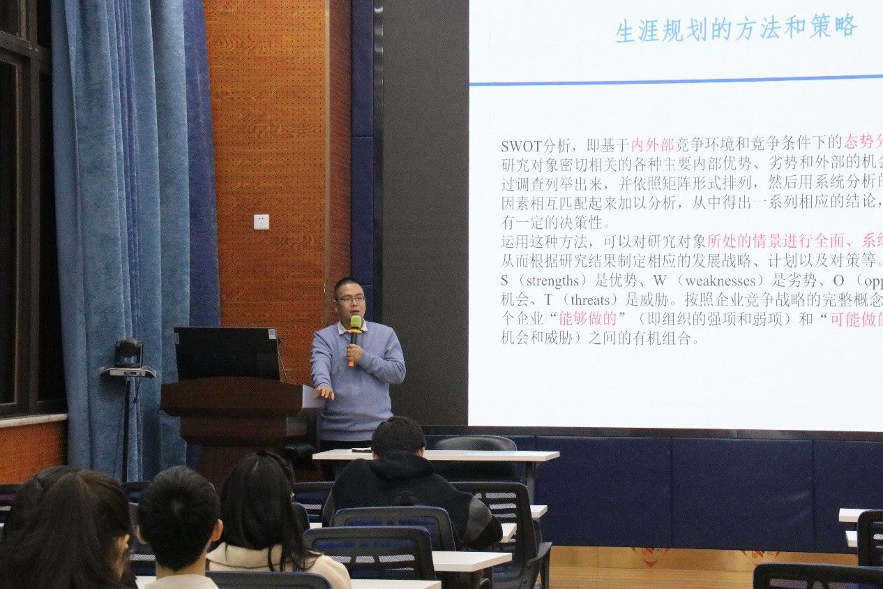 互动环节后,毛吉保引出了本次讲座的第一部分——职业生涯规划的目的和意义。他指出,一个准确合理的生涯规划不仅可以减轻同学们的职业压力,缓解大学生就业问题,还可以调动大学生的奋斗积极性,激励学生自觉增长才干,促进学生全面发展。